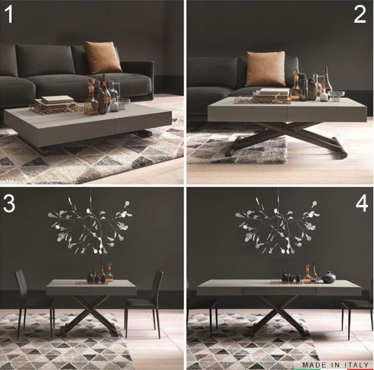 This is why we propose the new and unmissable conception of design and space-saving: the transforming coffee tables that become dining tables. They are designed to be used in any situation and, above all, with extreme ease; These tables can be lifted only with a light pressure of the hand and can be locked at any height, also becoming aperitif tables and not just the classic dining tables.
