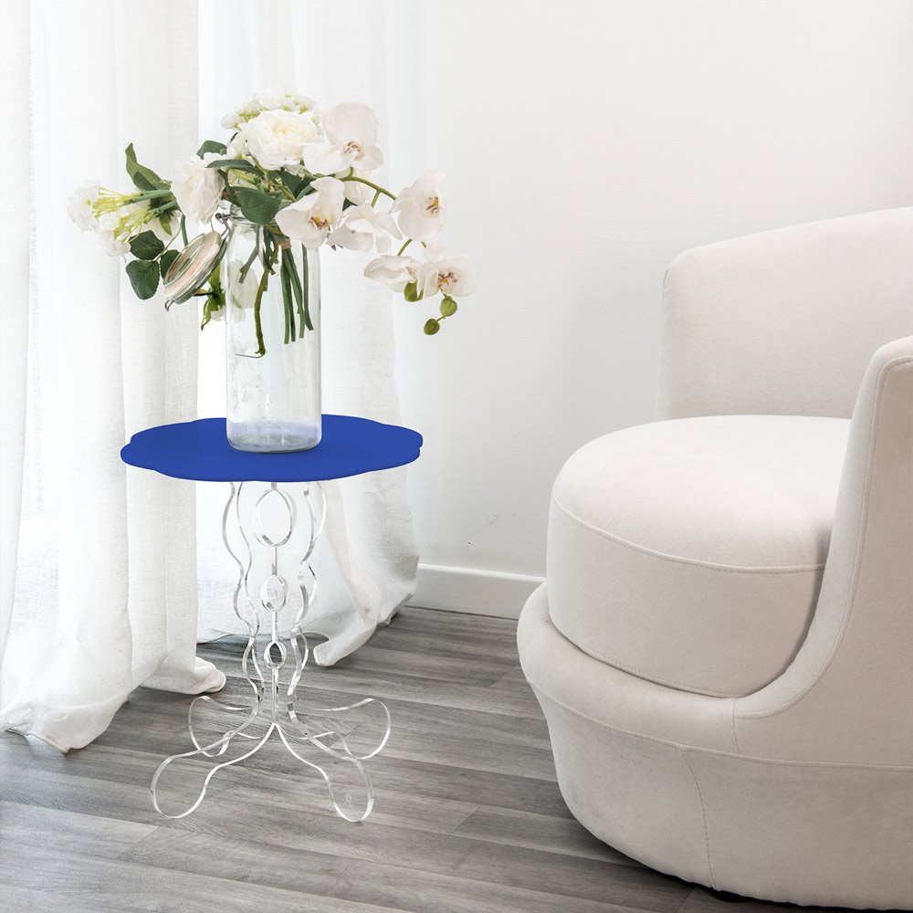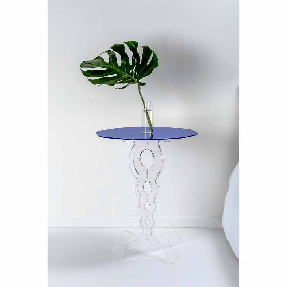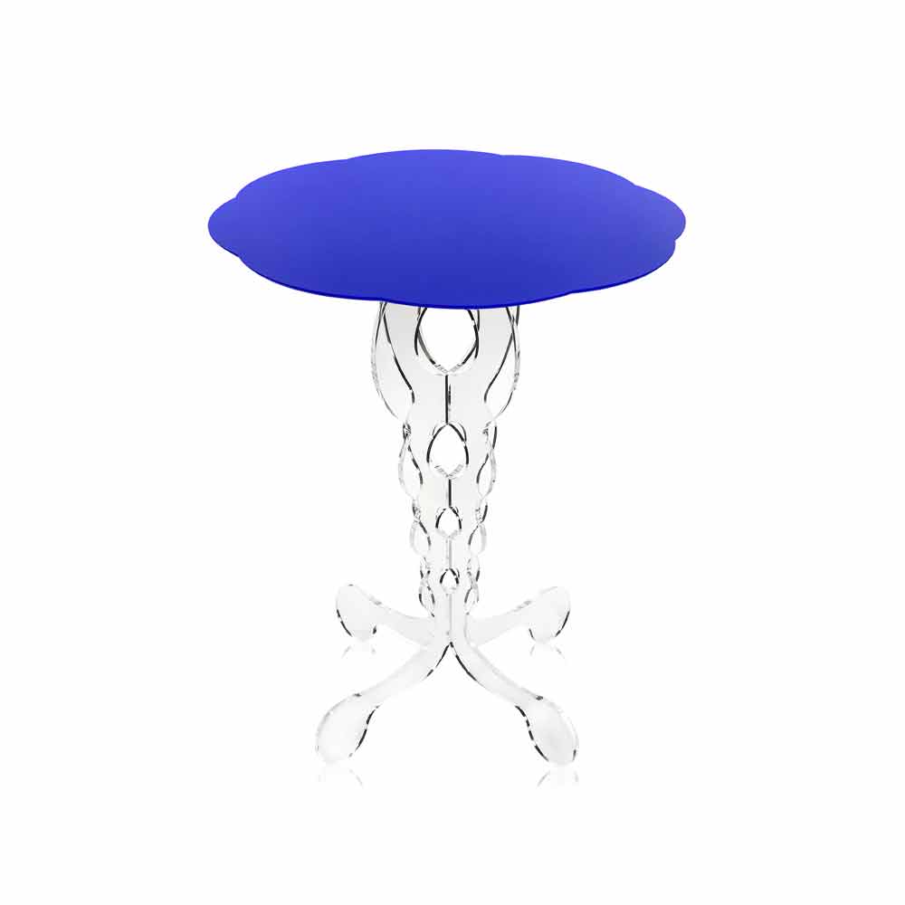 A moorish design characterises the Janis table, which can be used both as a coffee table or as a bedside table. The table base is made of laser-shaped 100% PMMA plexiglass. The table top gives a touch of color to the environment.