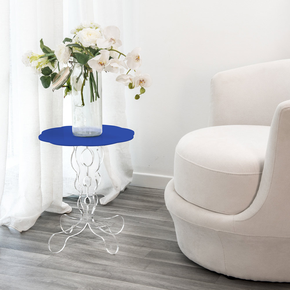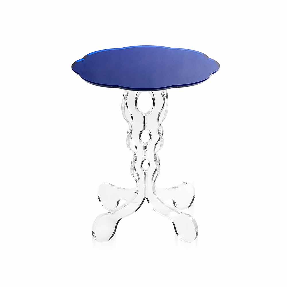 A moorish design characterises the Janis table, which can be used both as a coffee table or as a bedside table. The table base is made of laser-shaped 100% PMMA plexiglass. The table top gives a touch of color to the environment.
