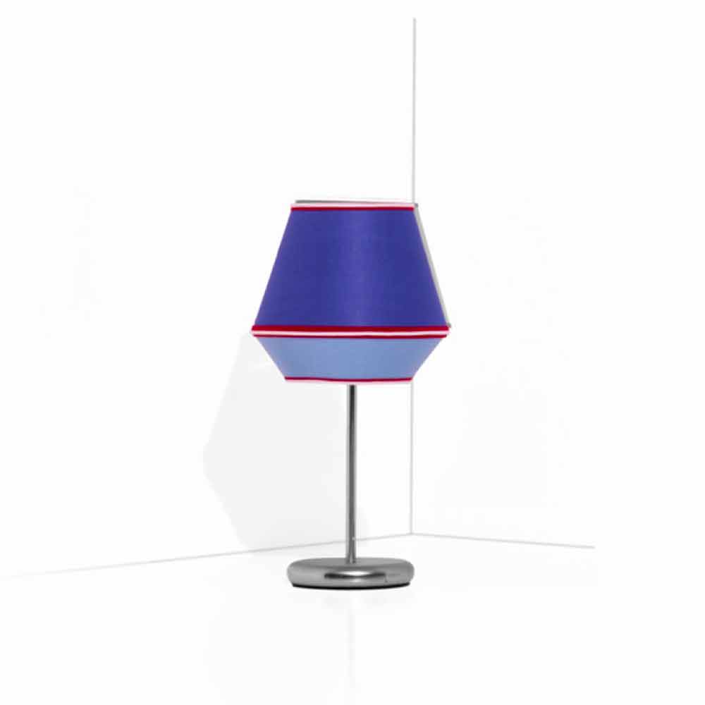 Made entirely in Italy , this table lamp is composed of a chromed metal base on which the blue and light blue cotton lampshade enriched with red and white inserts is installed.