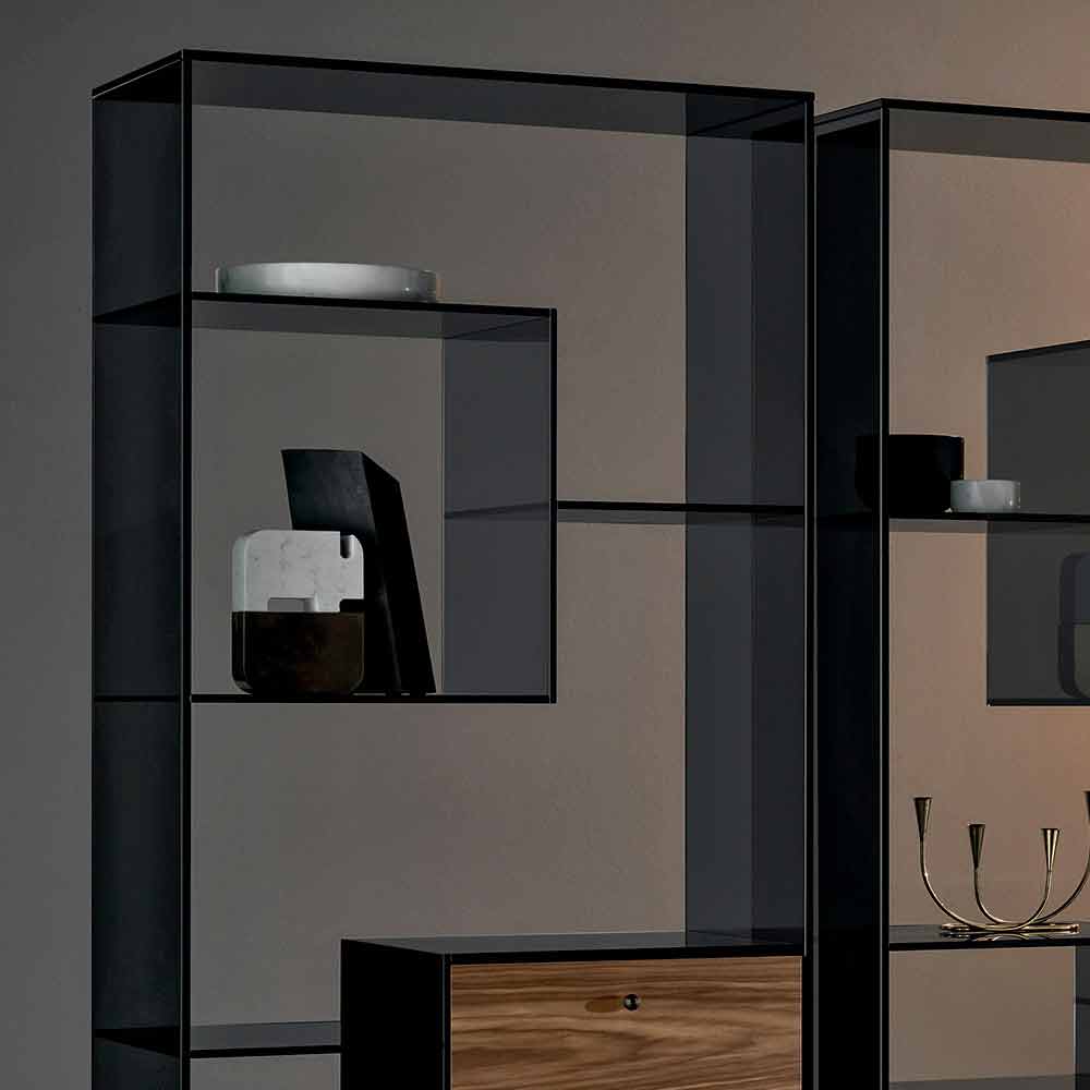 This display bookcase is characterized by its determined and elegant design entirely made of smoked glass.