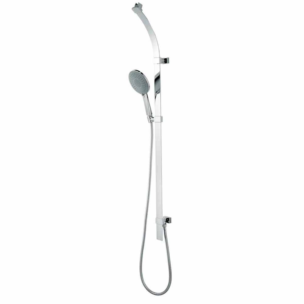 Brass side rail FLAT 120 cm with adjustable wall brackets (max. fixation distance 85 cm),  lower bracket with built-in water outlet, shower MIXA/3 FITAIR Ø 140 mm, double seamed brass flexible water hose 150 cm,  conical 1/2 FF.
