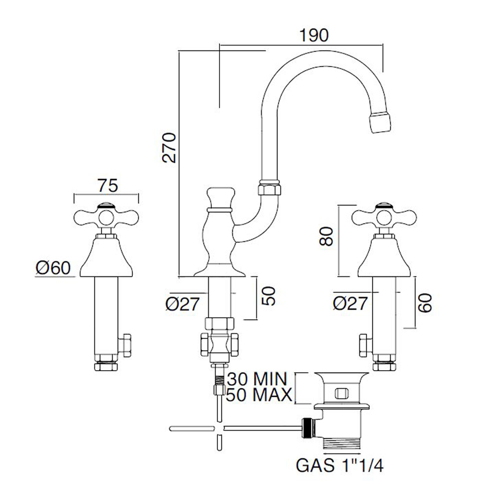 3-hole high spout basin faucet with brass drain, high quality made in Italy.