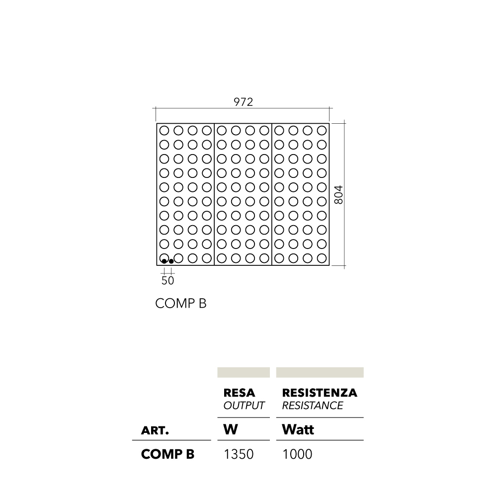 Measures L. 972 mm, H. 804 mm, 50 mm centre distance; 1000 Watt electrical resistance