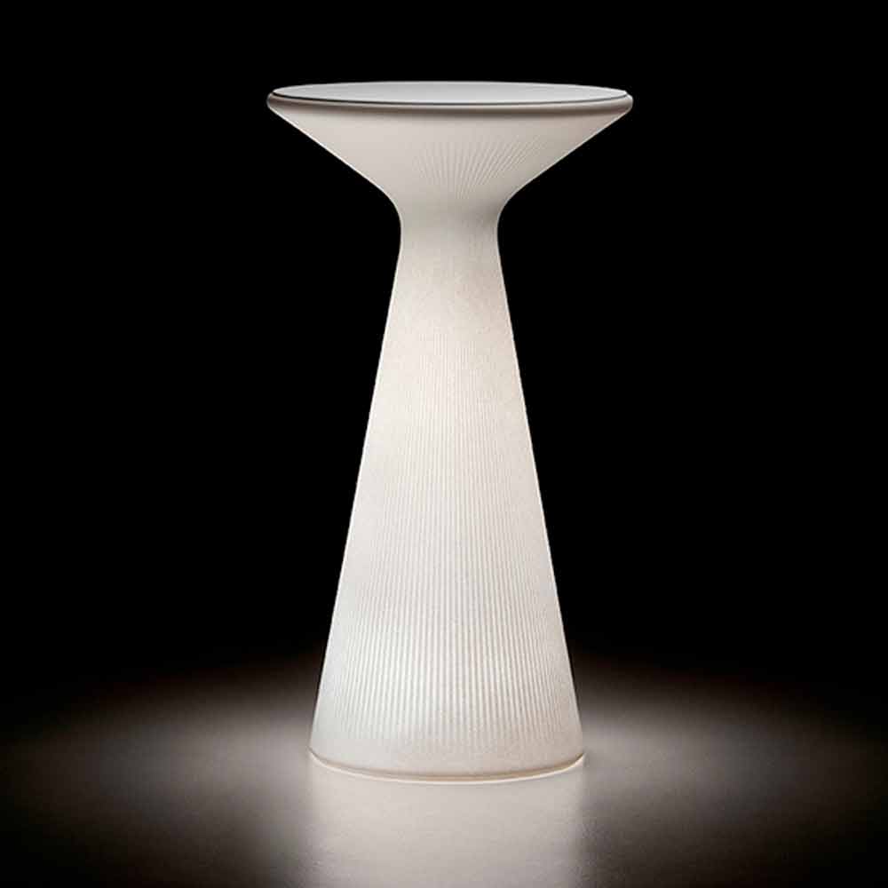 Round outdoor coffee table made in Italy with polyethylene structure and white HPL top. Simplicity and functionality distinguish this modern high table ideal to be used as a practical support surface but at the same time capable of playing a purely decorative role thanks to its innovative and original design. The particular striped surface that covers the entire base of the product makes the aesthetics of the coffee table interesting, enriched by the RGB LED light which, illuminating the structure, gives life to ideal atmospheres for spending wonderful evenings in company in domestic spaces such as gardens and terraces but also in contract environments where it is necessary to find a furnishing solution that is as functional as it is aesthetically appealing.