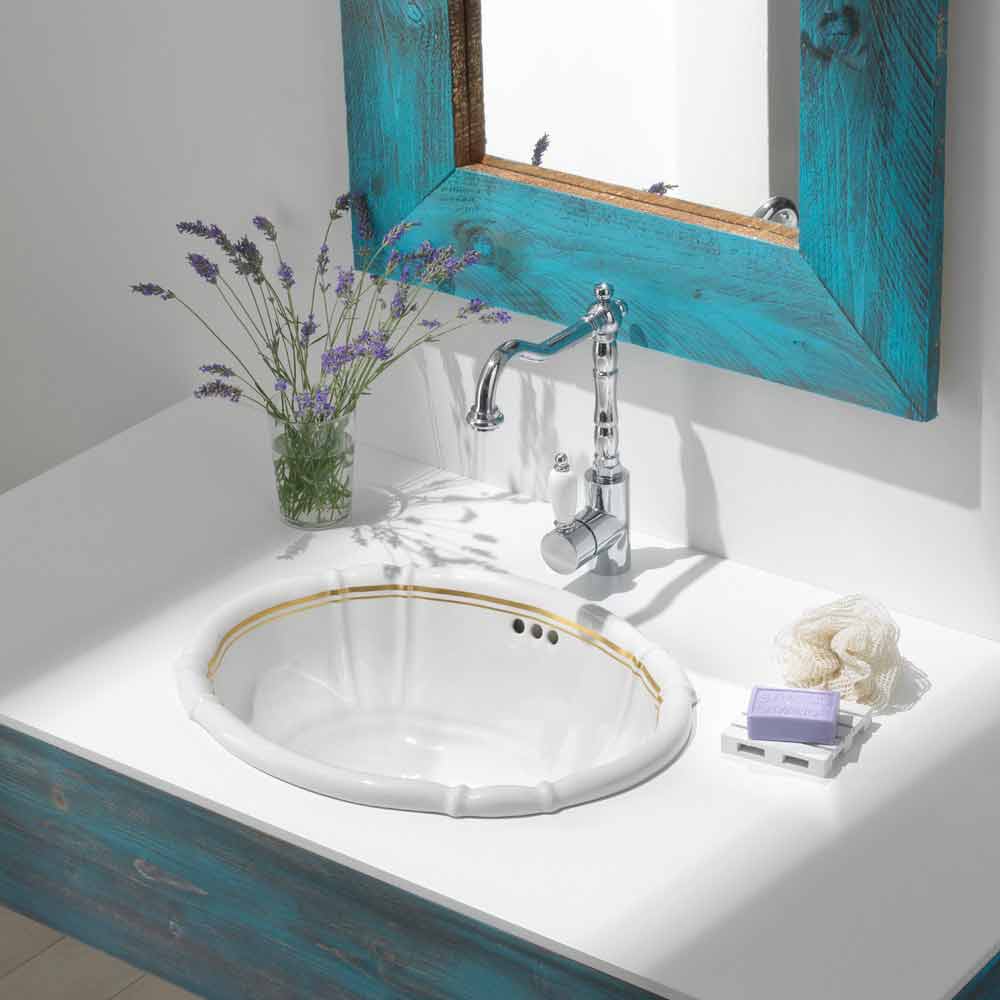 Built-in bathroom sink handmade in Italy in white fine porcelain with double line on the edge in 24 carat gold.