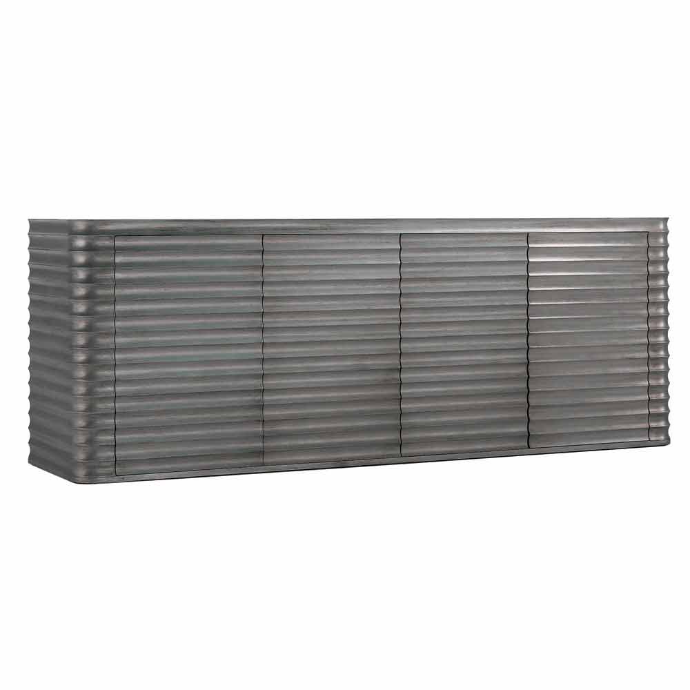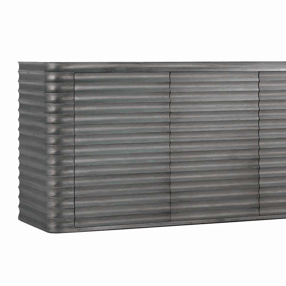 Cabinet with 4 doors in molded wood design, L230xP49 cm, Dana Low cabinet 4 doors with wooden structure machined with numerical control machine. Waved effect. Dana is available in the following finishes: patinated bleached maple or lead. Select the finish you want from the drop-down menu.