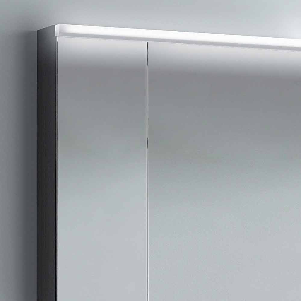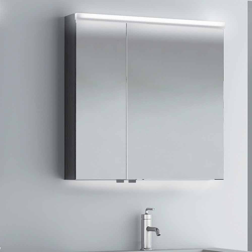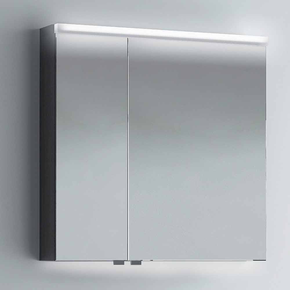 Bathroom mirror cabinet with two doors and LED illumination. A thin line of light conveys a perfect frontal illumination, which can be easily controlled by a sensor.