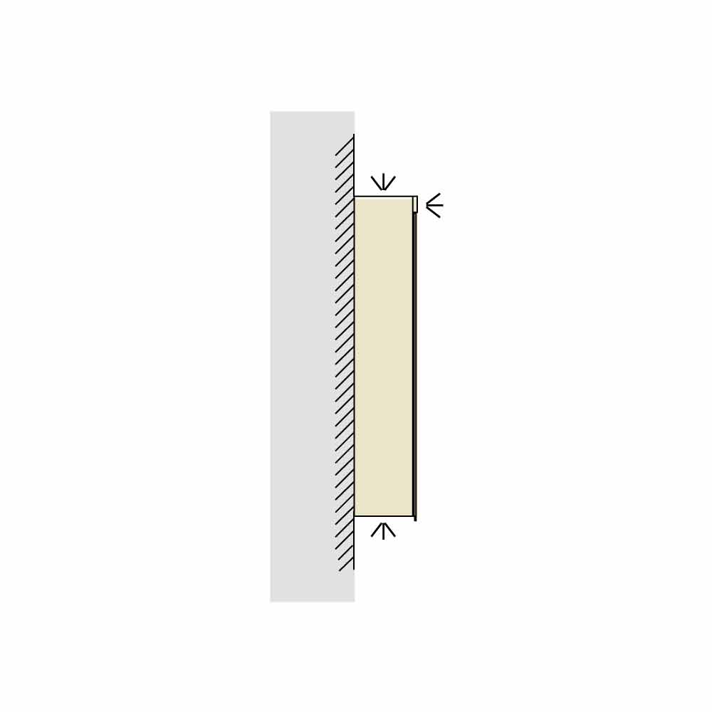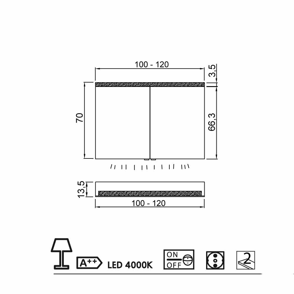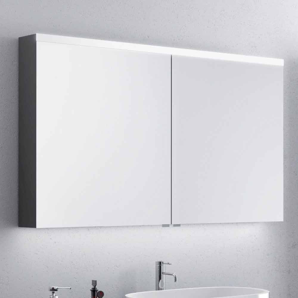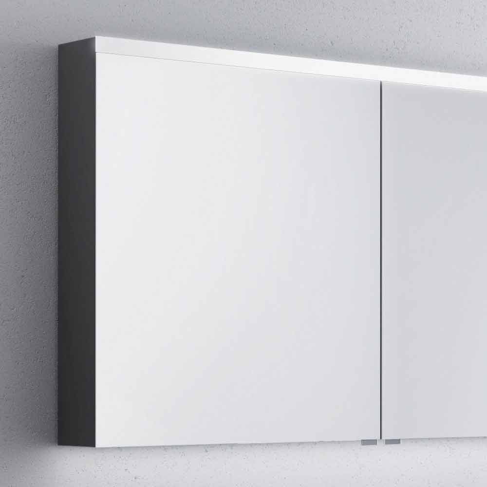 Bathroom mirror cabinet with two doors and LED illumination. A thin line of light conveys a perfect frontal illumination, which can be easily controlled by a sensor.