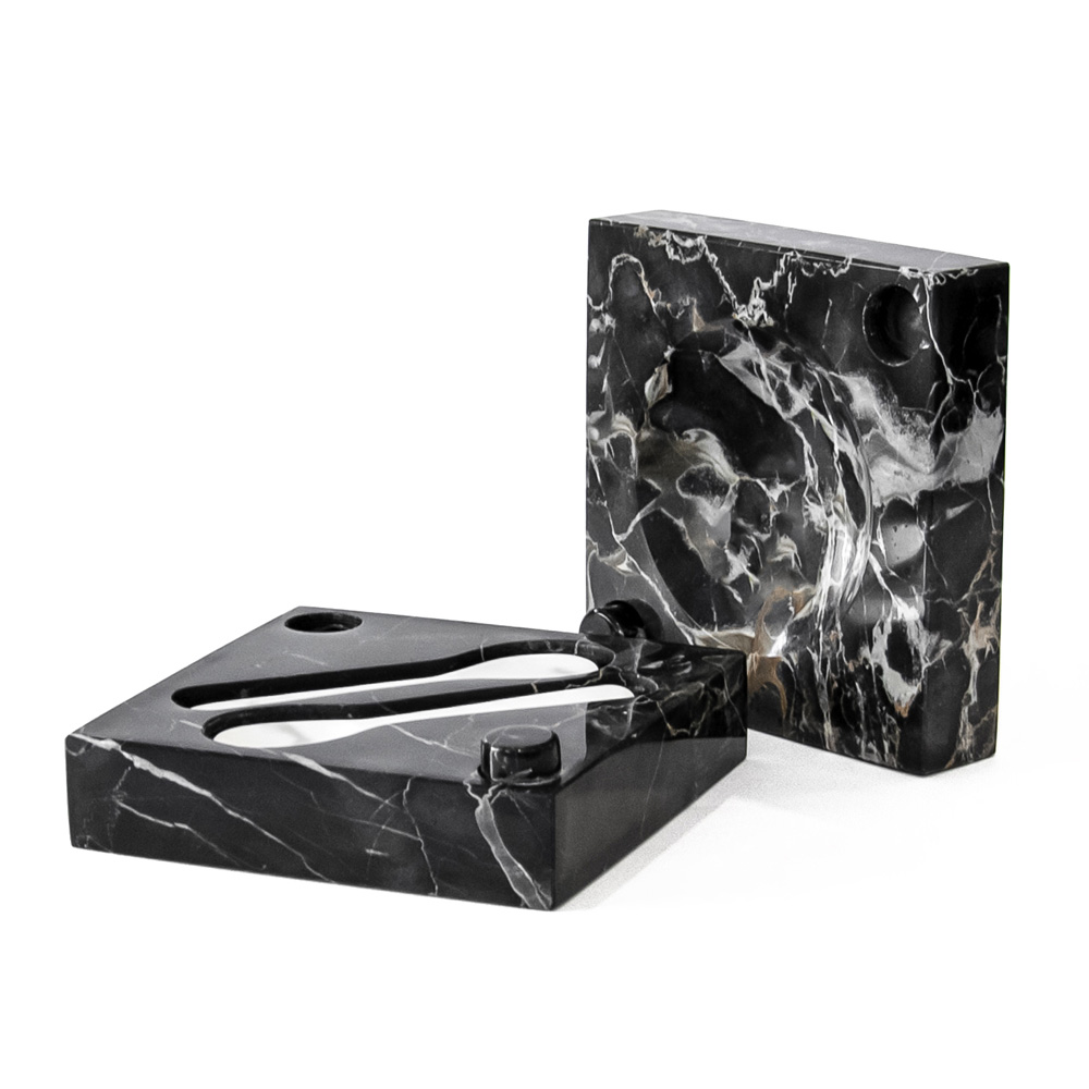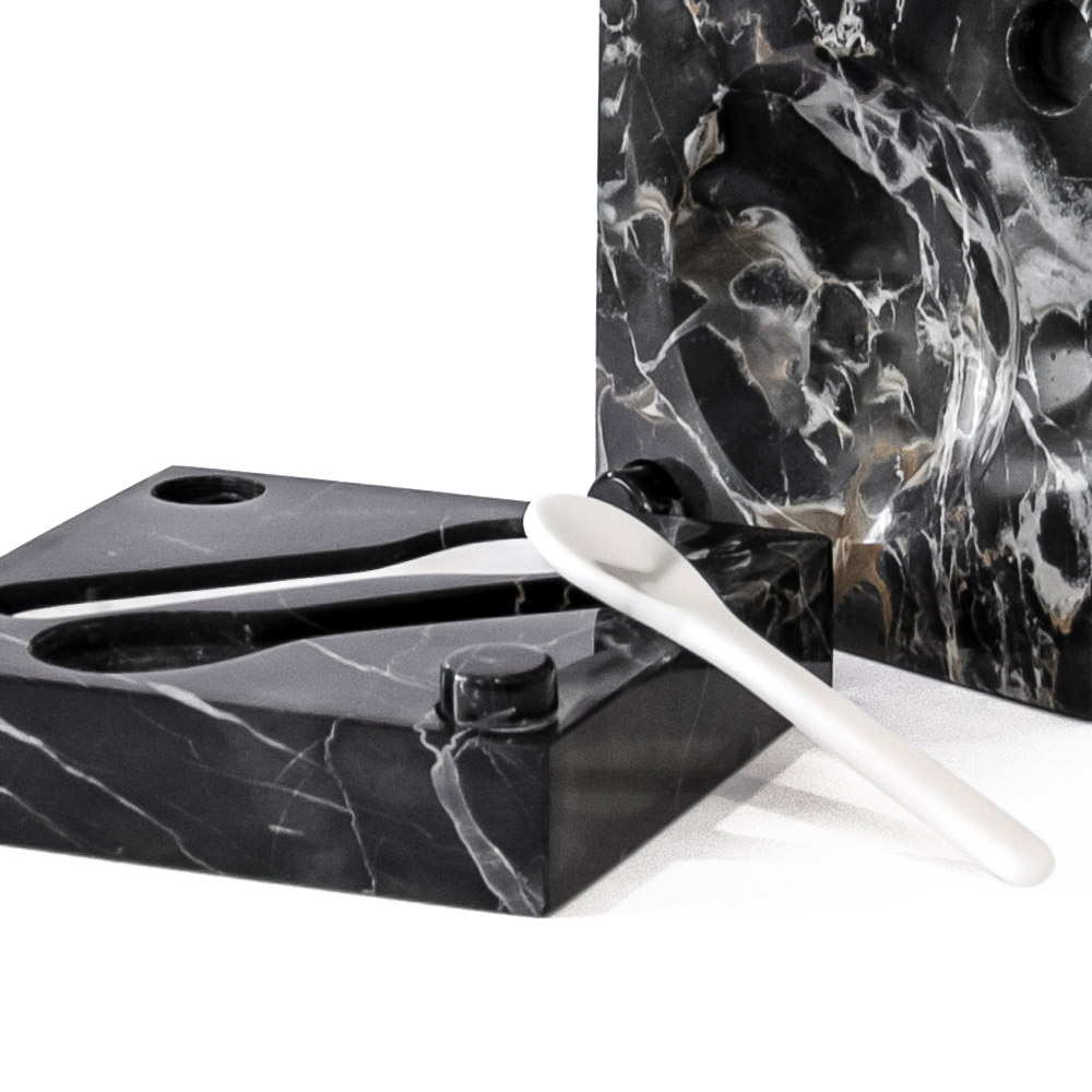 Portoro marble caviar holder with white Carrara spoons, made in Italy design.