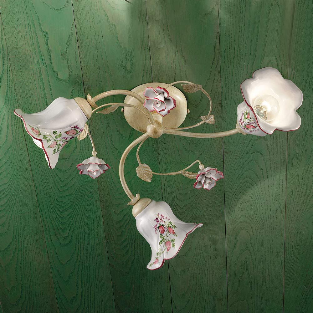 3 lights ceiling lamp in metal and ceramic with hand painted roses made in Italy by Ferroluce.
