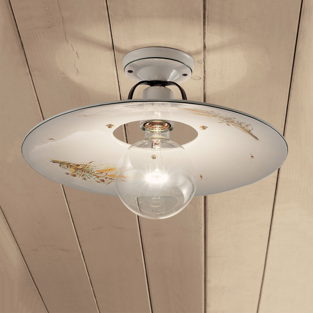 Vintage ceiling lamp in rough iron and ceramic with hand decorations, 2 sizes made in Italy by Ferroluce.