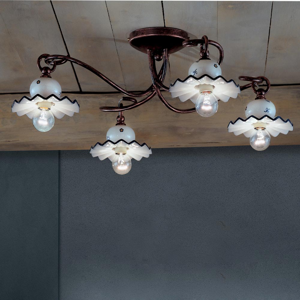 Handcrafted 3 or 4 lights ceiling lamp in metal and hand painted ceramic made in Italy by Ferroluce.