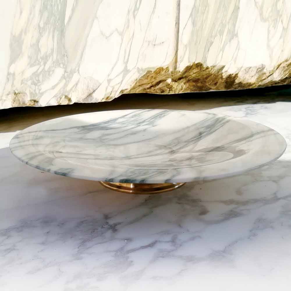 Centerpiece characterized by a sophisticated design and its shape with sinuous and harmonious lines that give a light and modern look to the product. Made in Italy by hand , this product is composed of a gold-finish metal base and a round plate in Brezza della Versilia marble, a compact marble with a warm white base and aquamarine veins that recall the sea breeze, creating an original and refined effect. . The finish is glossy and is obtained thanks to an artisan process that gives the product further quality and refinement. The combination of materials, finishes and techniques used together with the wonderful work of the master craftsmen allow to obtain a high quality final product with attention to detail and perfect for decorating environments with a contemporary and sophisticated taste.
