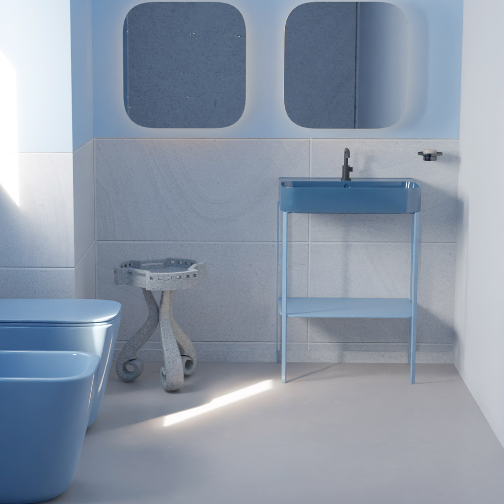 The structure, with a lower shelf , not only supports the sink elegantly but also provides a useful storage area, optimizing space without sacrificing style.