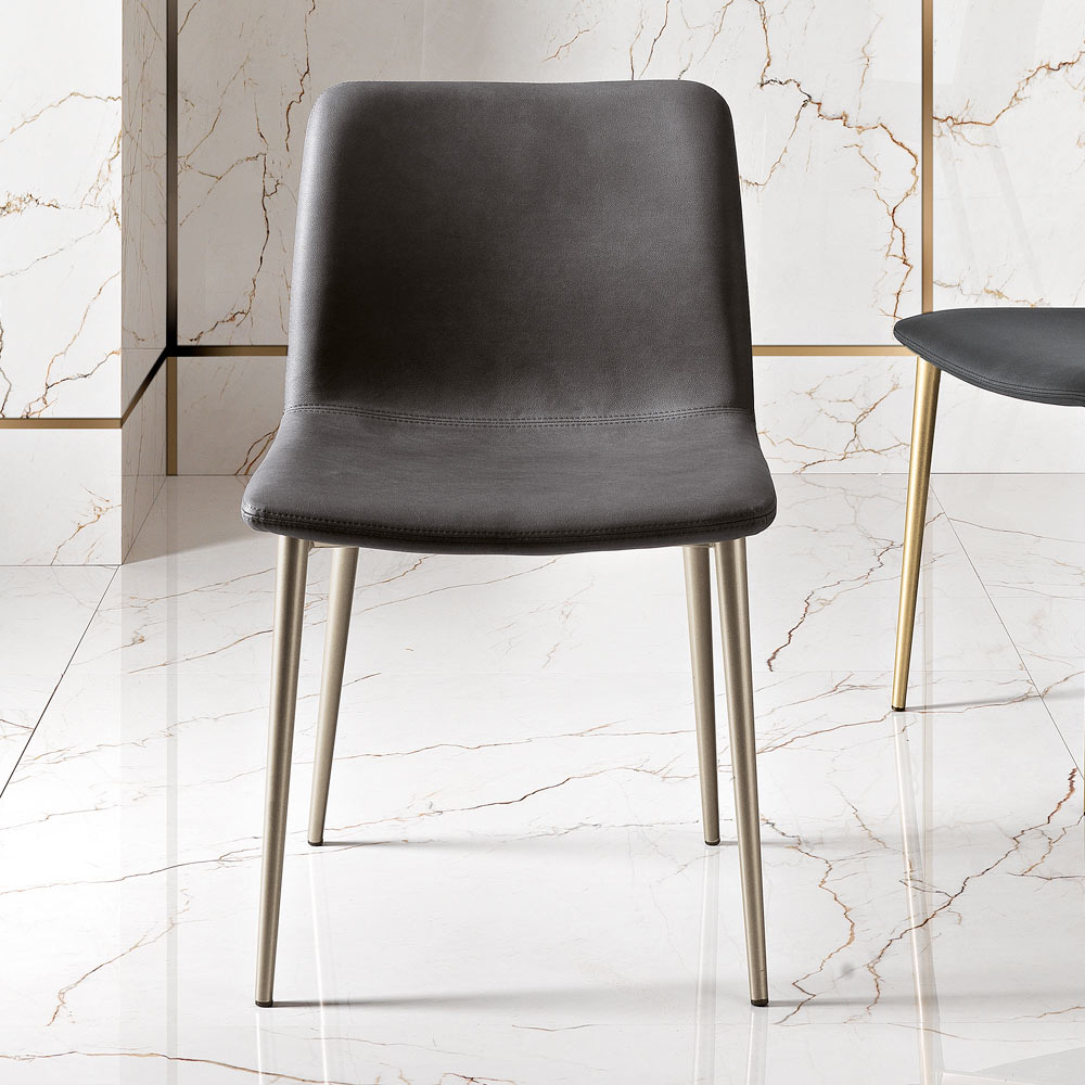The soft padding and well-thought-out ergonomics promise comfort for long sessions, whether it's a dinner with friends or a day at work. The metal legs are thin but strong, giving the chair a solid and durable base, while their minimal design contributes to an atmosphere of refined simplicity.
