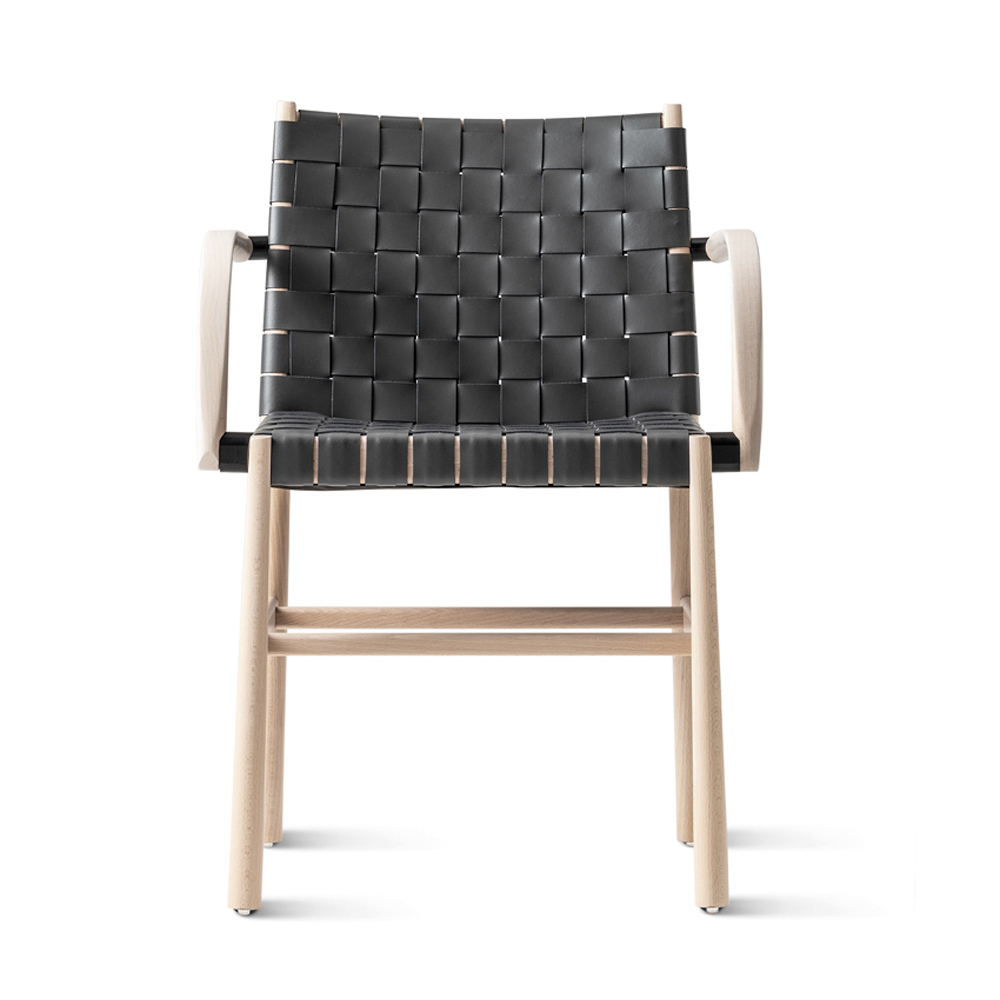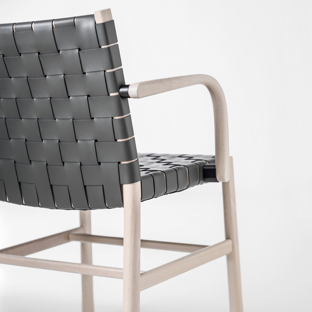 Modern chair with armrests made in Italy with structure in bleached beech wood and back and seat in woven leather . Tradition and modernity meet and merge to create this innovative design object with an elegant taste able to characterize any environment in an original and creative way . The particular weave of leather that covers the chair makes it extremely fascinating , ideal for enriching and personalizing your spaces with character. Thanks to the wide range of colors available, it is possible to choose between a sober and discreet look or a more colorful and extravagant solution, thus managing to satisfy every need while creating a wonderful harmony with the surrounding furniture.