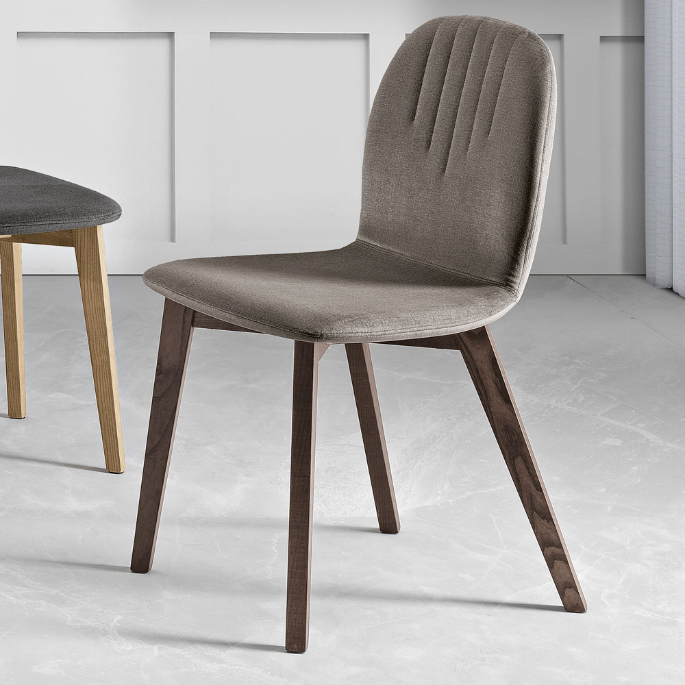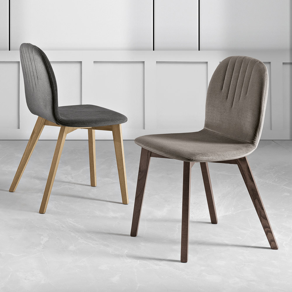 This chair elegantly combines the tone of the wood of its legs with the color of the fabric seat. The modern, streamlined backrest design, embellished with a delicate linear pattern , adds a touch of class that instantly elevates any dining table or workspace.