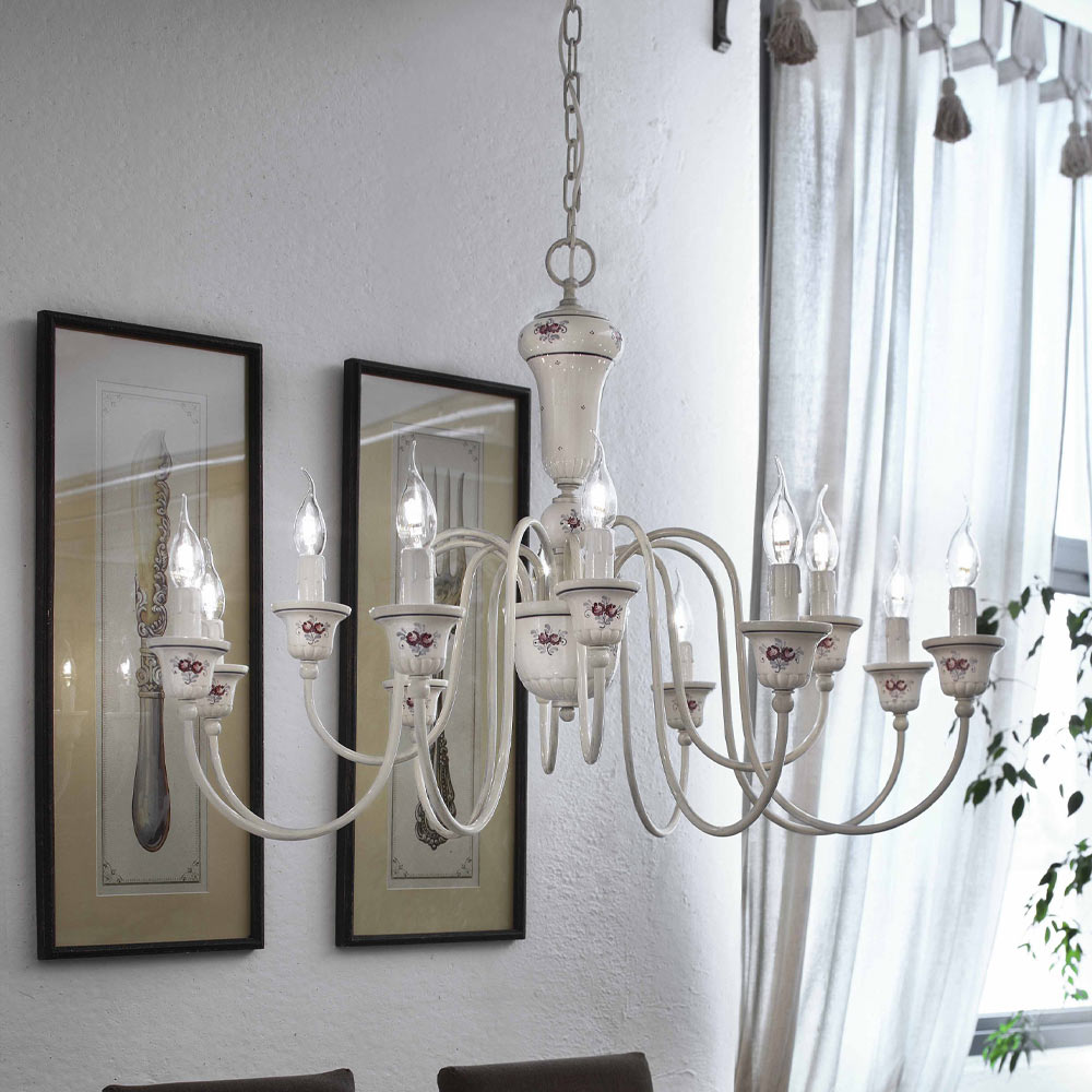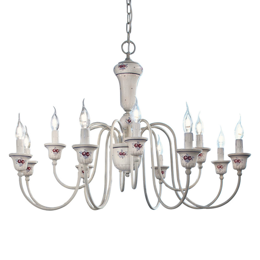 This 12 lights chandelier is entirely handcrafted in painted brass and ceramic with hand painted floral decoration, Ā to highlight the craftsmanship and manual skills of the artisans.