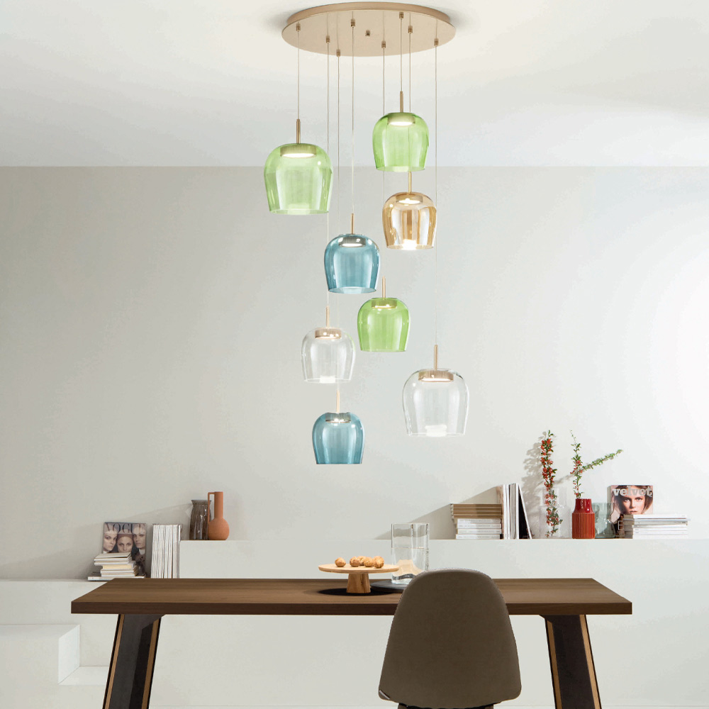 Chandelier entirely produced in Italy made of gold-colored painted metal with adjustable length cable and LED lights with removable colored glass lampshade .