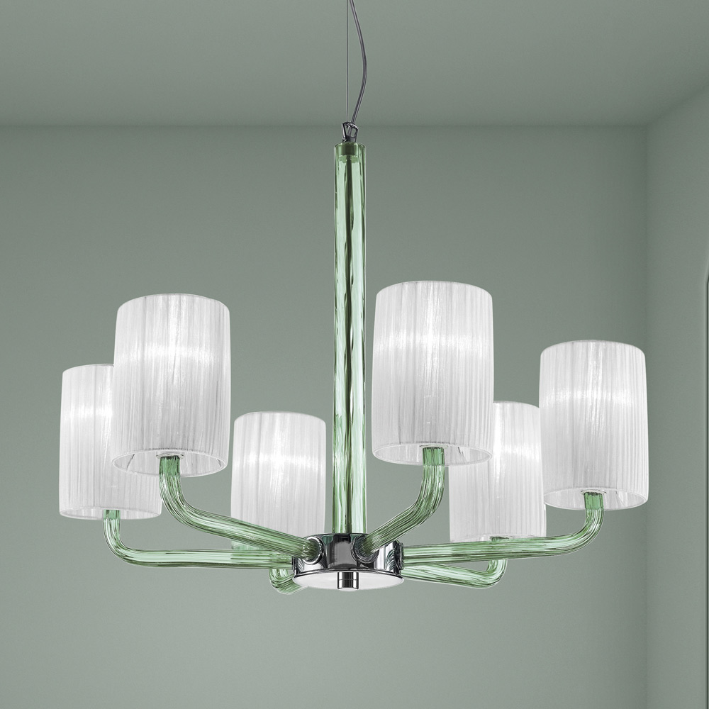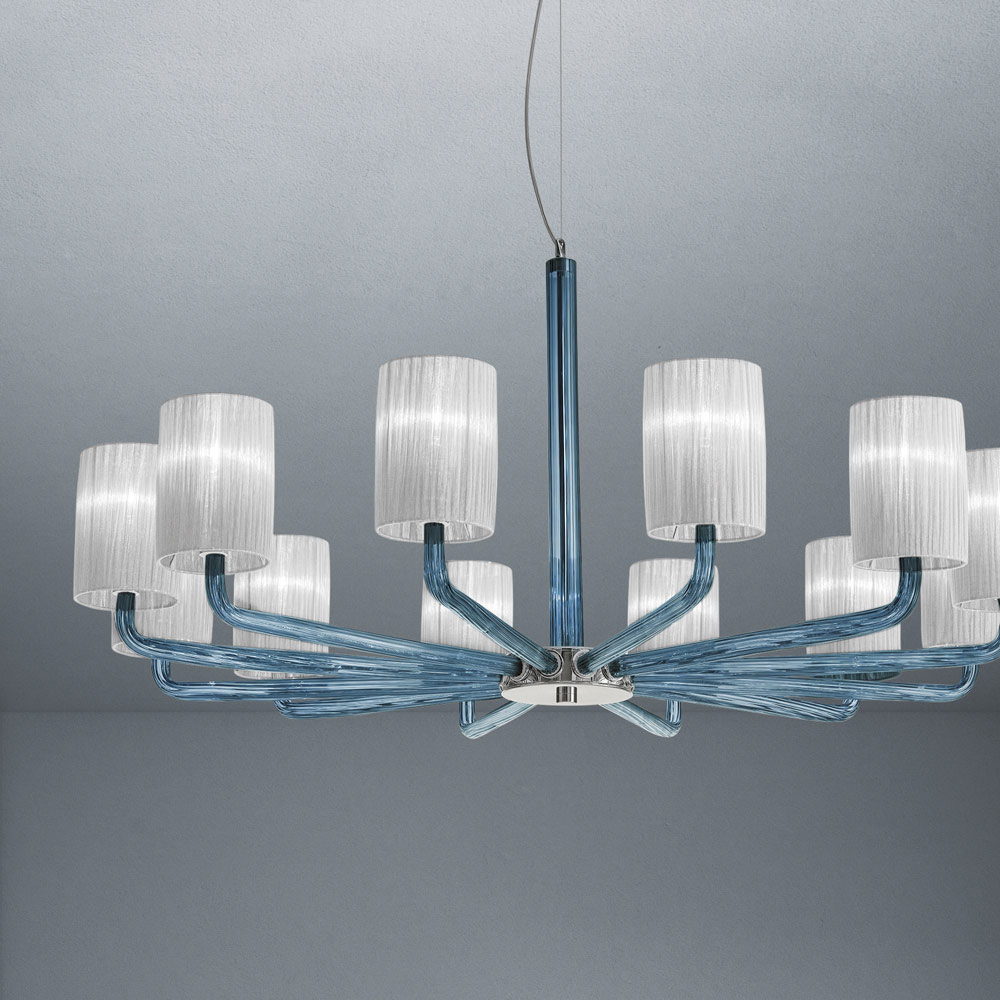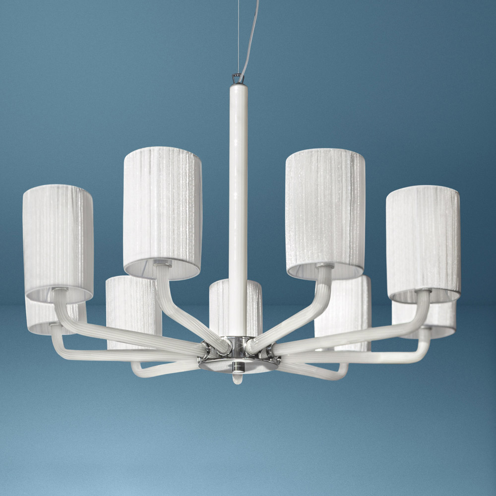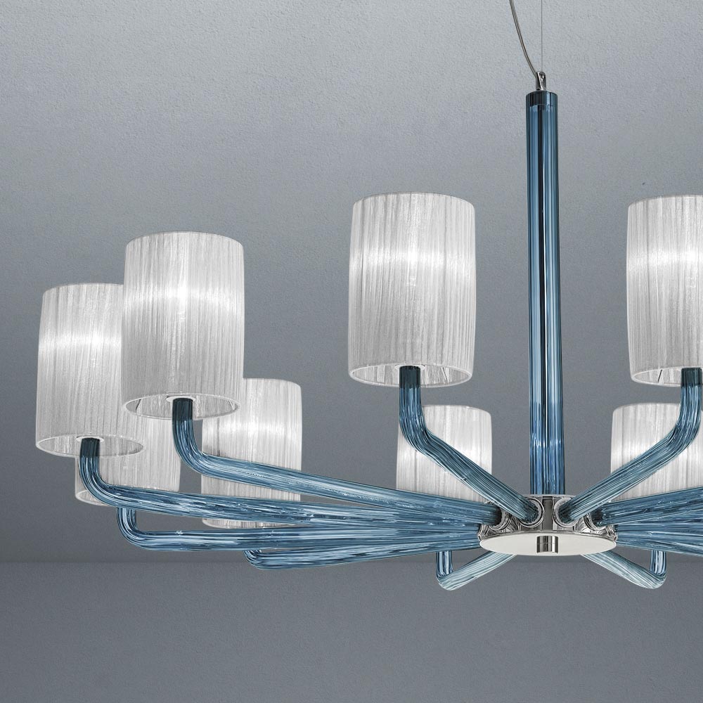 Handcrafted chandelier made in Italy in Venetian glass with metal details in shiny chrome finish and fabric lampshades . A piece of furniture characterized by an articulated but essential design , able to enrich the environment giving character thanks to its strong stage presence typical of the classic chandeliers of the past. The tubular glass arms support in a delicate and classy way the wonderful fabric lampshades which help to carry the light in every direction for a warm , soft and enveloping lighting.