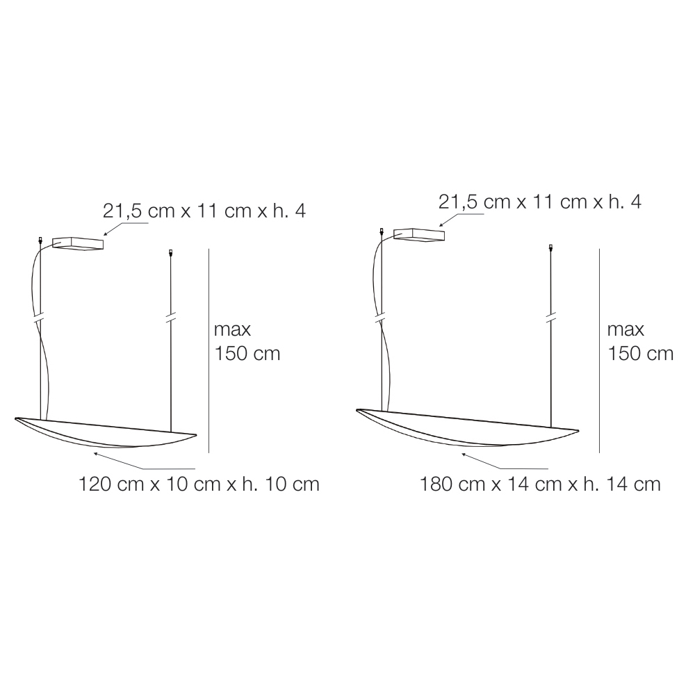 • diffuser 180 x 14 cm x height 12 cm - ceiling structure 30 x 11.5 x height 4 cm - maximum total height 150 cm - DIMMABLE