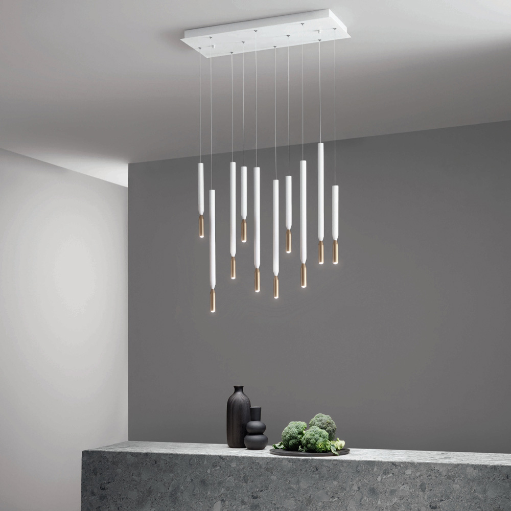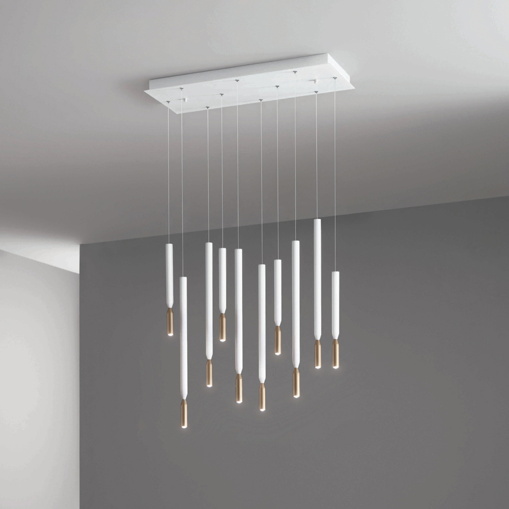 Chandelier entirely produced in Italy made of painted metal with white and gold finish and 10 dimmable LED lights with adjustable cables in length.