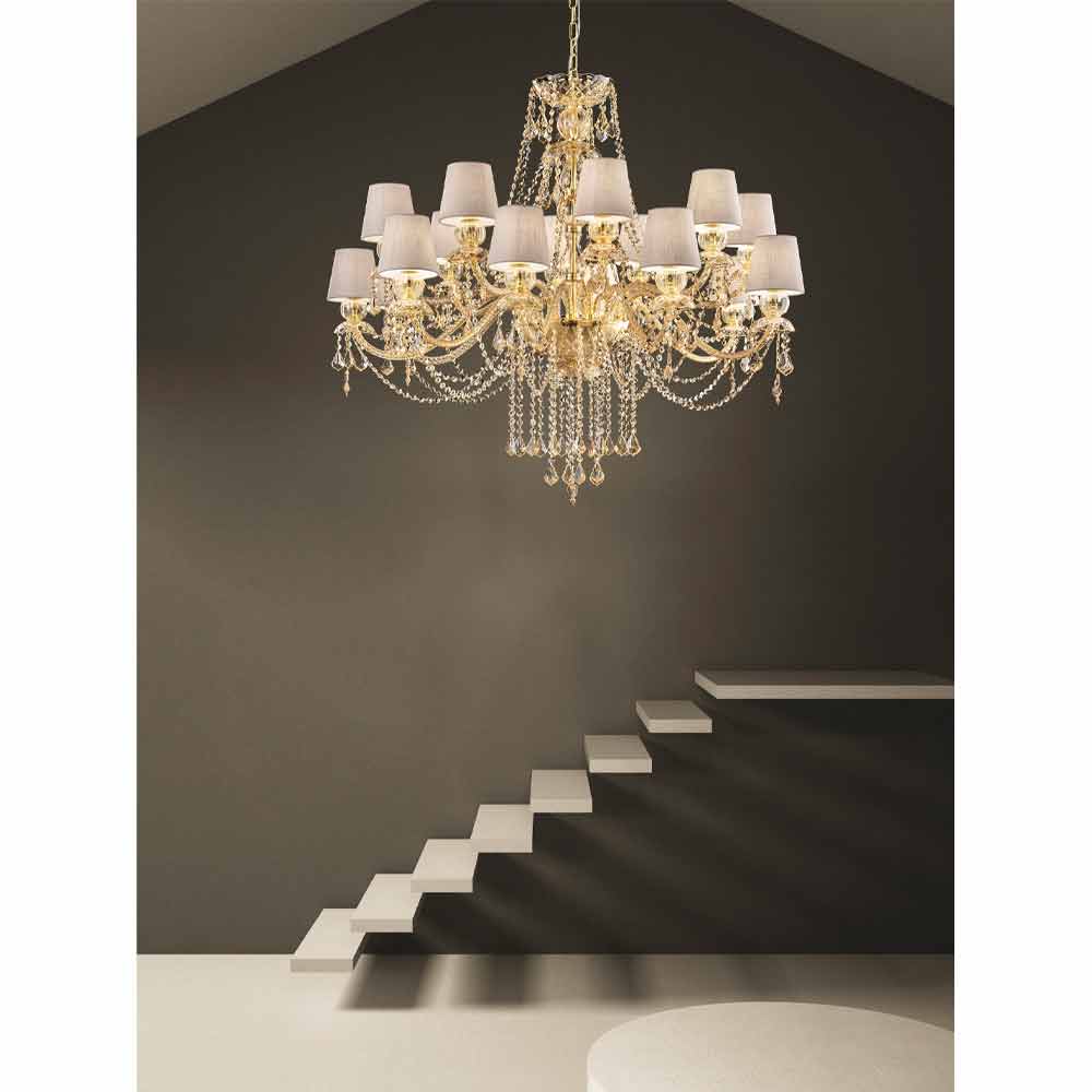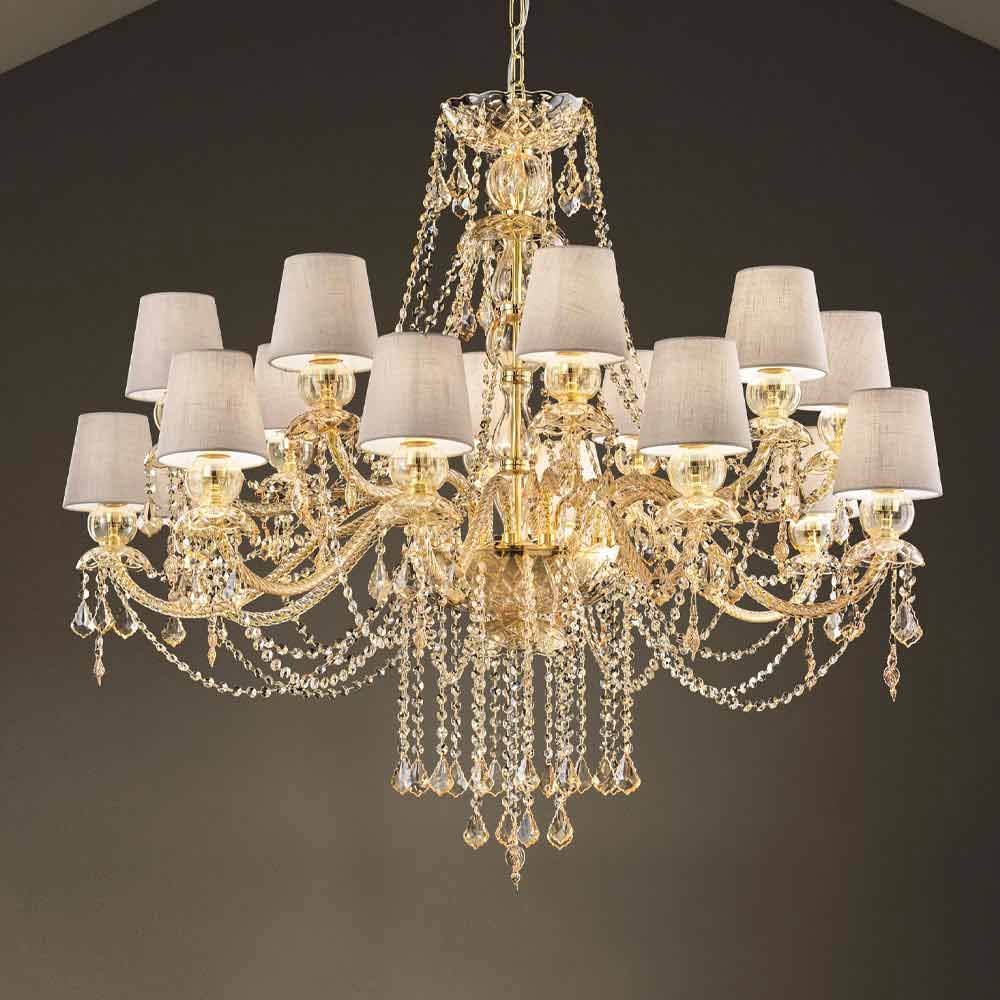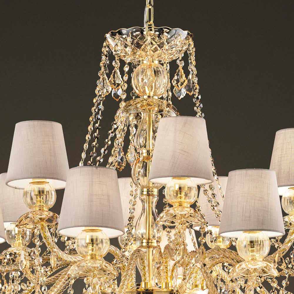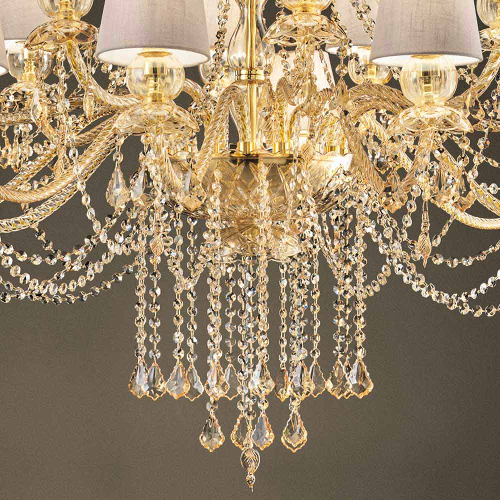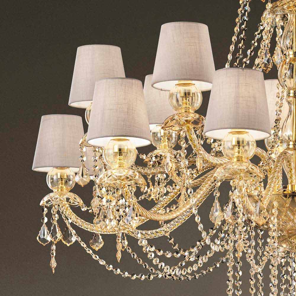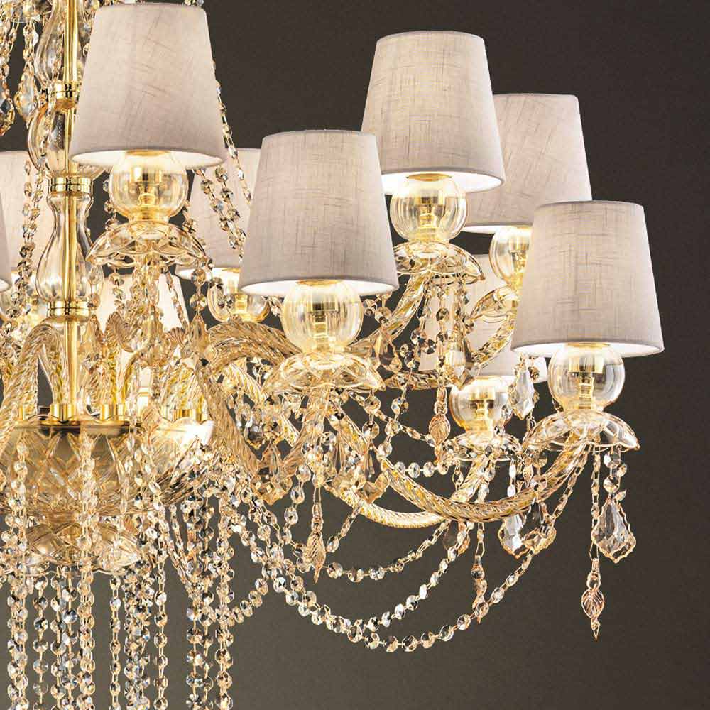 Refined chandelier with amber finish Venice glass structure enriched by elements in crystal finish, 16 linen lampshades and shiny golden metal details, handcrafted in Italy . Luminous pendants and fascinating lampshades represent the peculiarities of this wonderful furnishing accessory with a romantic soul capable of filling large rooms with personality and style with timeless elegance . Its aesthetic is made unique and interesting by the many sequins that through the refraction of light create colored beams of light and sophisticated play of light and shadow for a chandelier with a strong scenographic impact .