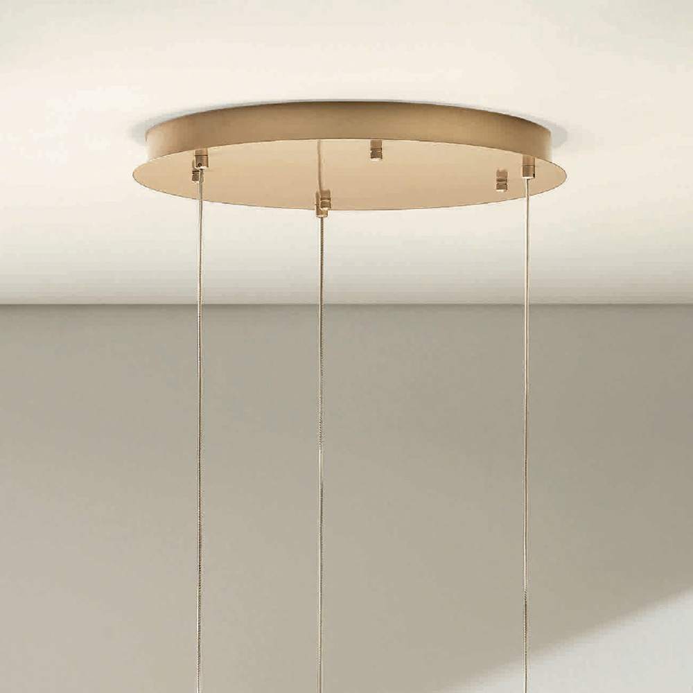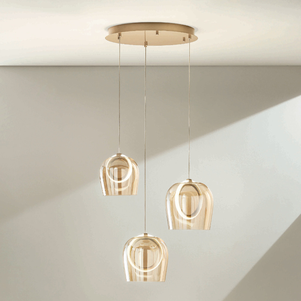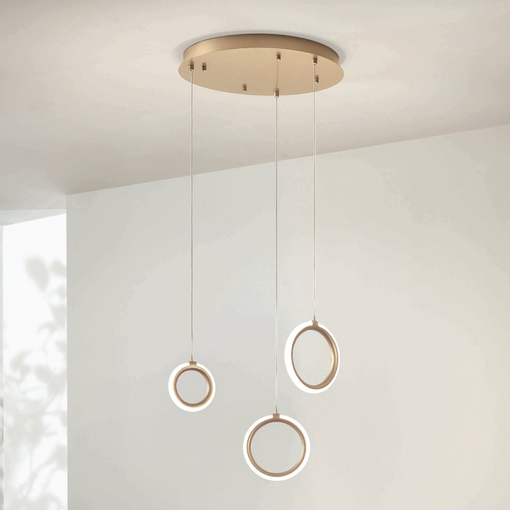 Chandelier entirely produced in Italy made of gold finish painted metal with adjustable length cables and 3 dimmable circle LED lights with optional amber finish glass lampshade .