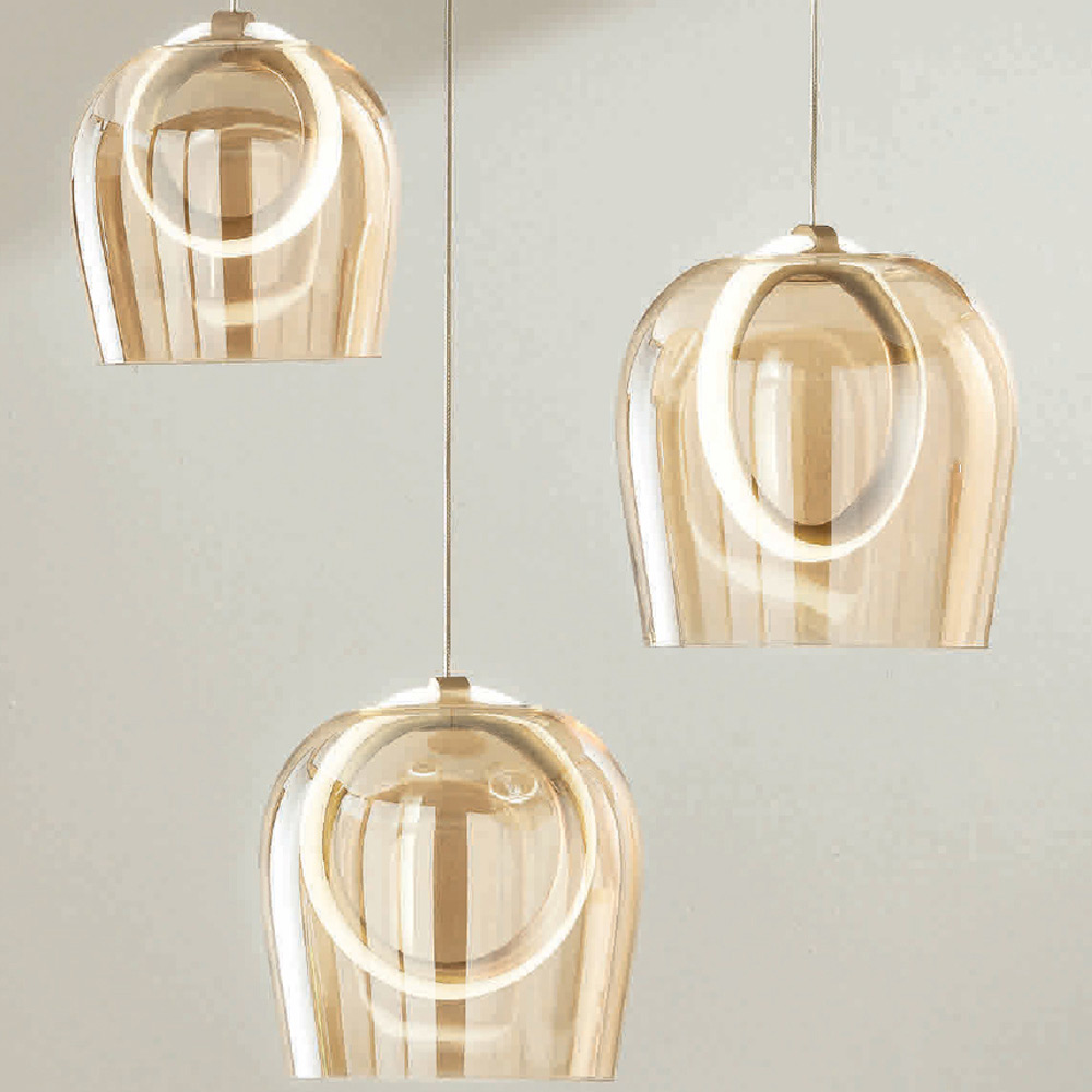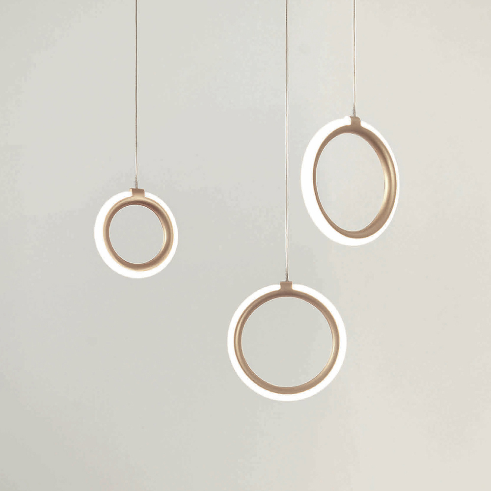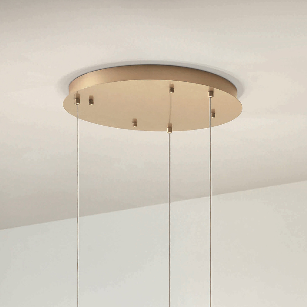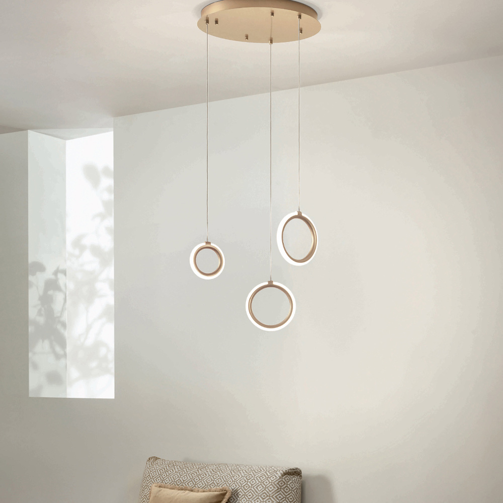 Chandelier entirely produced in Italy made of gold finish painted metal with adjustable length cables and 3 dimmable circle LED lights with optional amber finish glass lampshade .