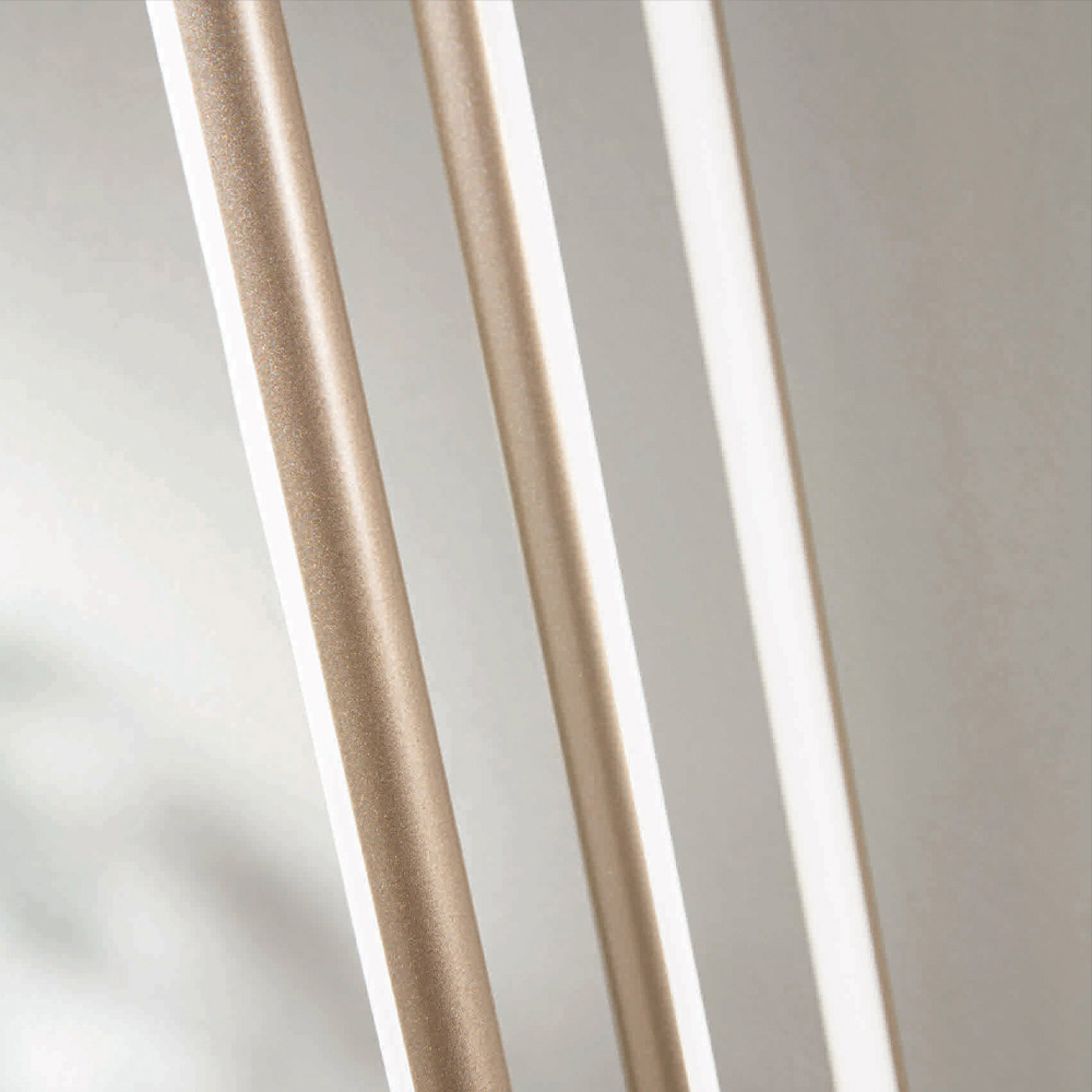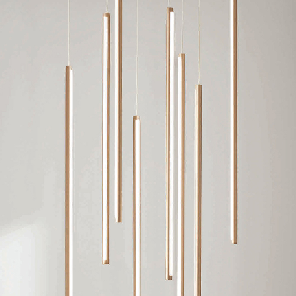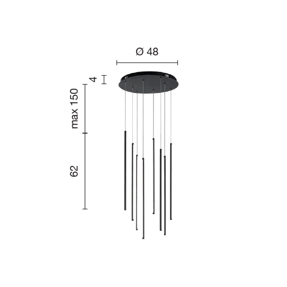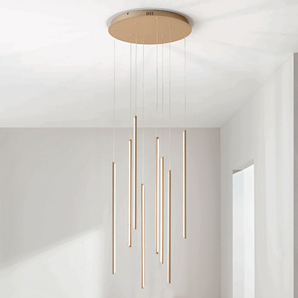 Chandelier entirely produced in Italy made of gold finish painted metal with dimmable LED light and length- adjustable cables .
