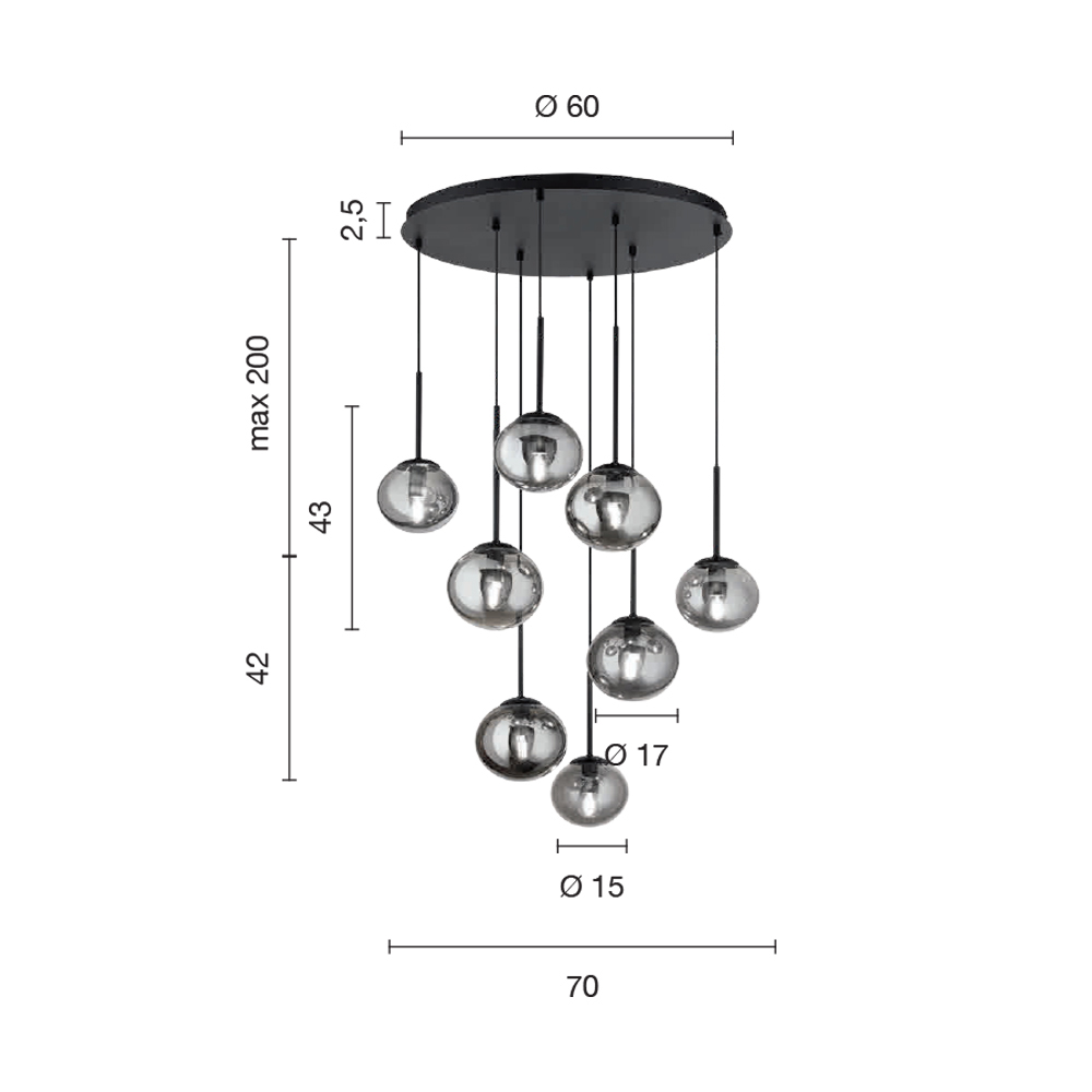 Chandelier entirely produced in Italy made of painted metal and gold finish blown glass with LED light and length- adjustable cables .