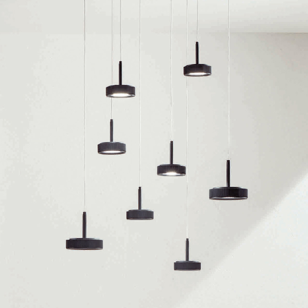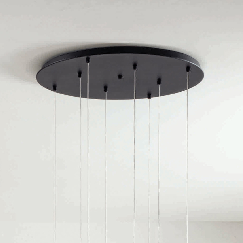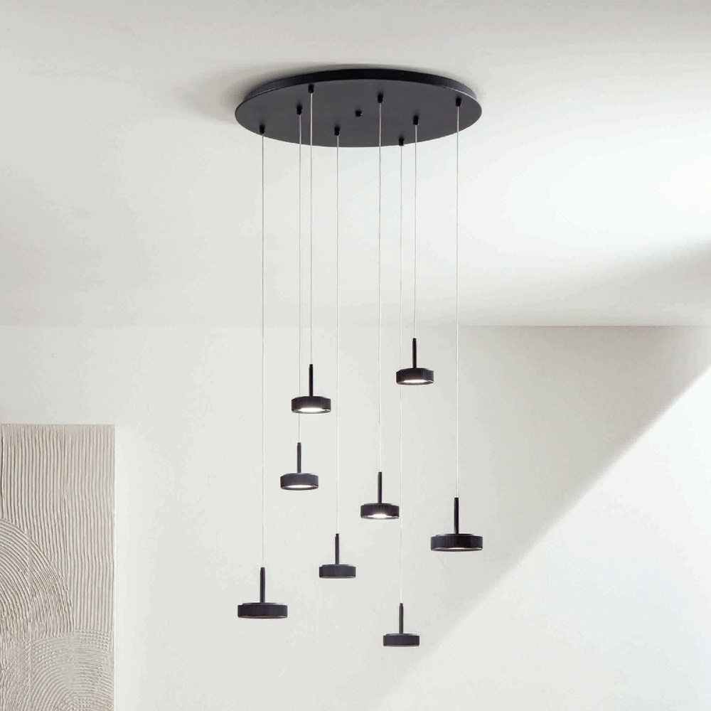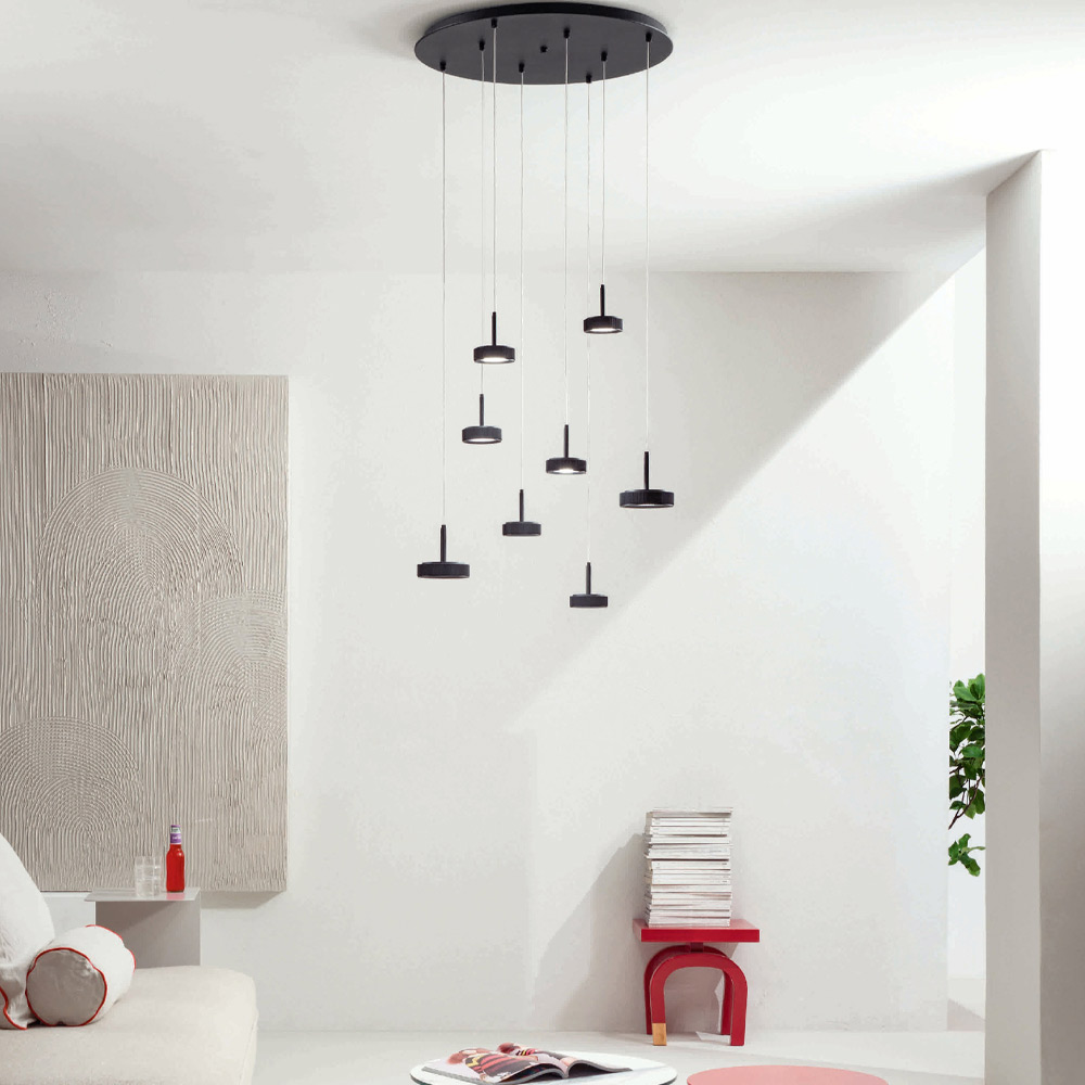 Chandelier entirely produced in Italy made of black painted metal with adjustable length cables and LED lights.