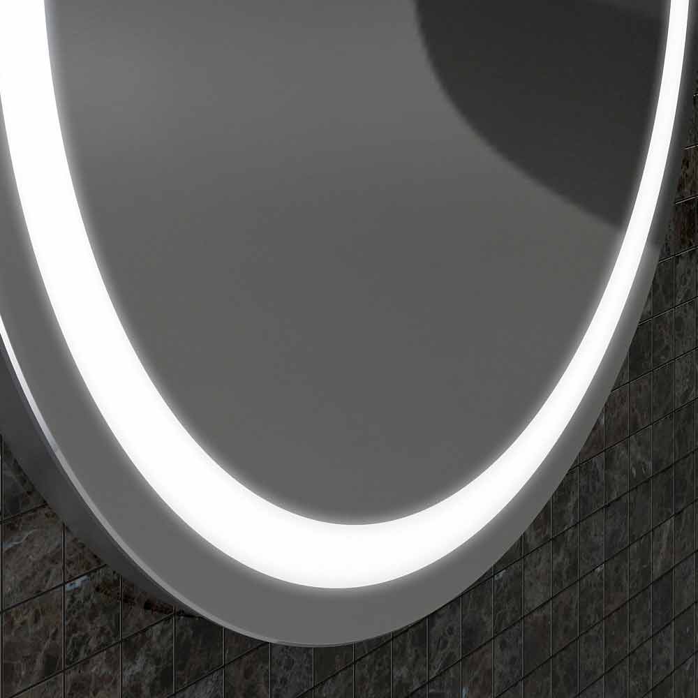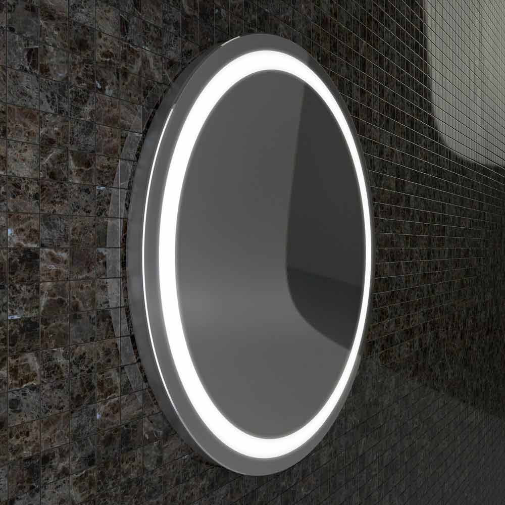 Round mirror with integrated LED backlighting and stainless steel edges.