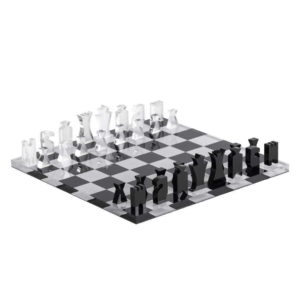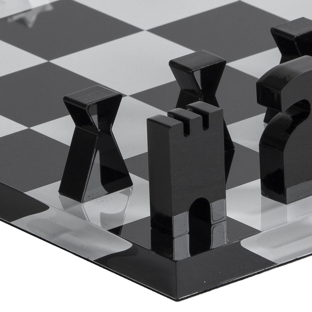 Elegant chess and checkers box with chessboard in transparent silk-screened acrylic crystal and black.