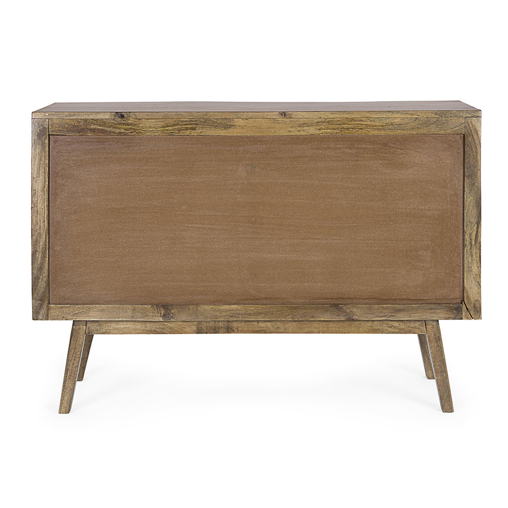 This designer chest of drawers for the living room has a structure and legs in mango wood with a water-based finish and back in MDF.