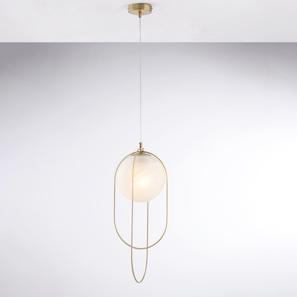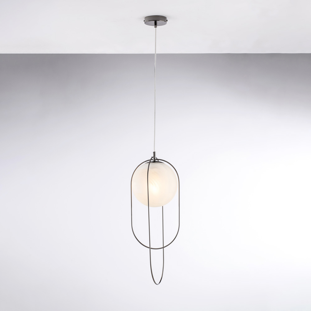 Simple and sophisticated, this designer iron pendant light with a glass sphere is a contemporary lighting solution, designed for those who appreciate clean lines and understated elegance. The slender metal structure houses a 20 cm diameter luminous sphere , creating a refined balance between form and light.