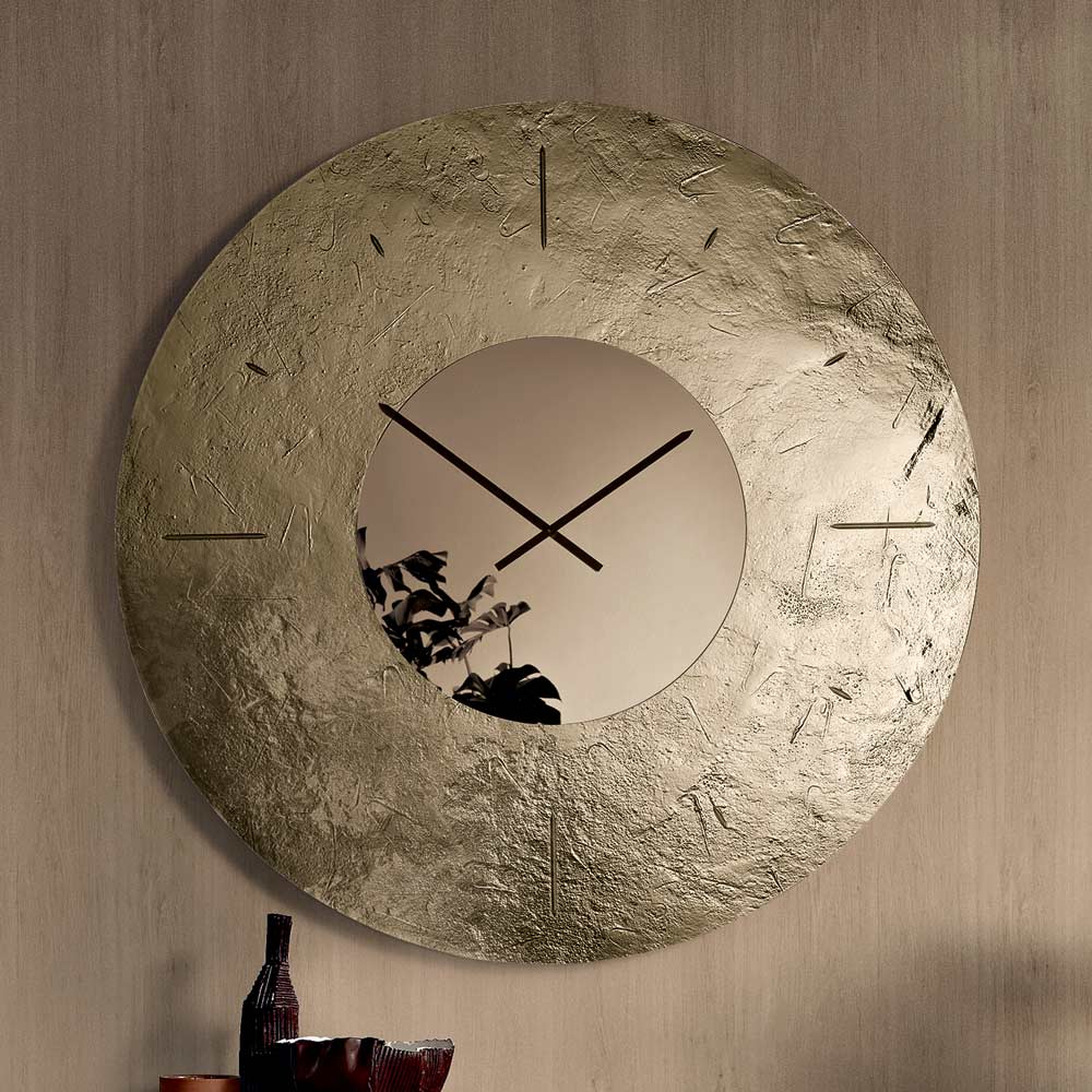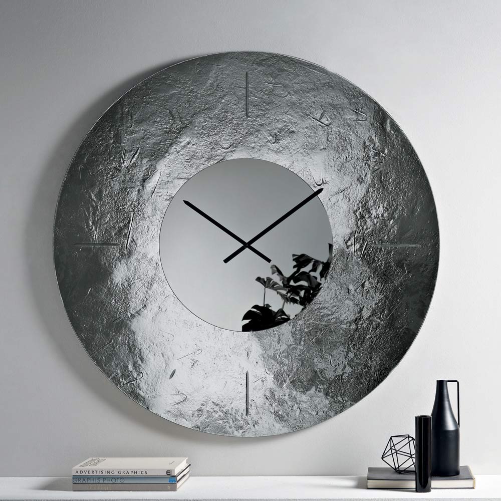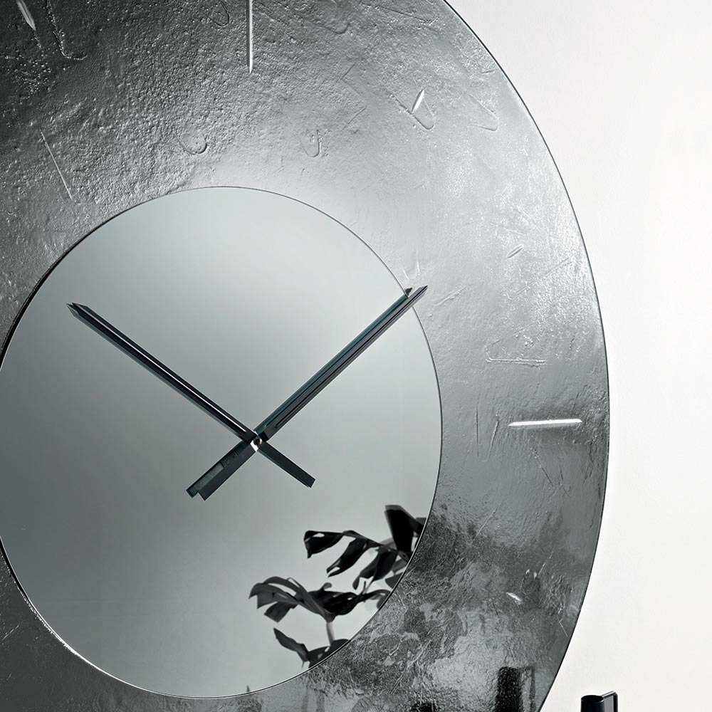 The clock features a visually striking round shape , embellished with a back-silvered hammered fused glass frame that creates a refined interplay of reflections and depth. At the center, a tone-on-tone mirrored insert houses the hands, lending balance and luminosity to the composition.
