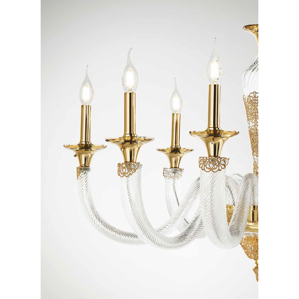 The 8-light chandelier is a luxury lighting accessory entirely made in Italy in high quality handcrafted glass and is characterized by the particular oval section of the arms.