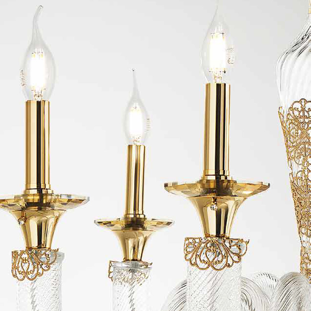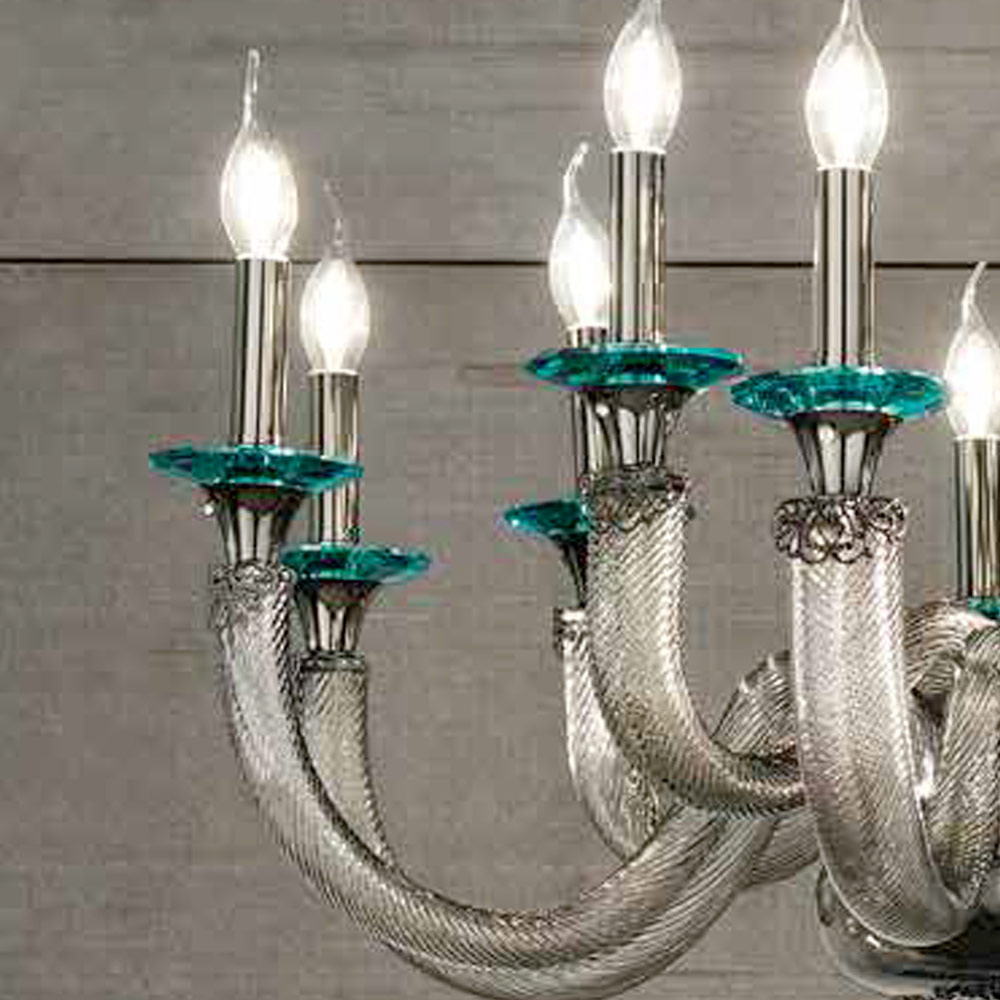 8 lights chandelier in handcrafted glass and crystals, Italian luxury.