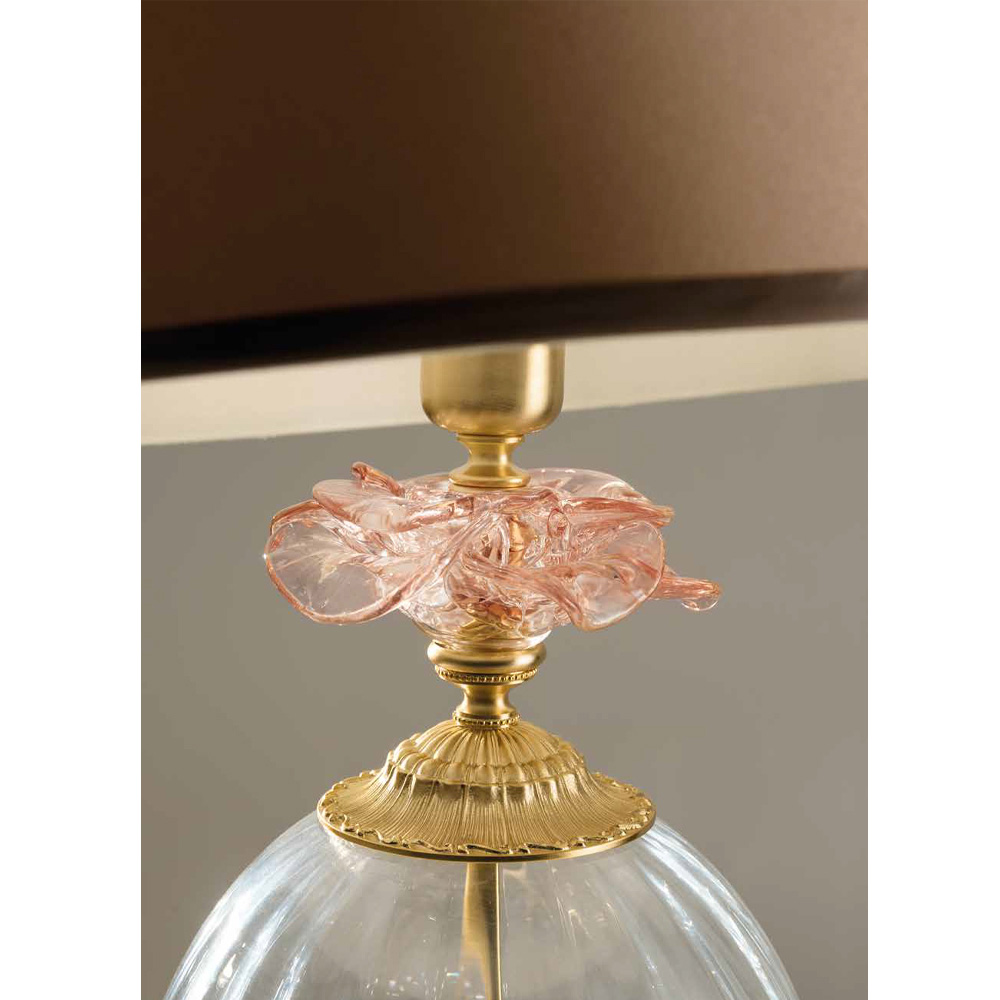 - Body in transparent glass - details in rosé glass - satin gold metal and champagne lampshade;