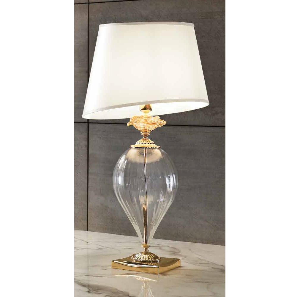 - Transparent glass body - honey glass details - shiny gold metal and cream lampshade.