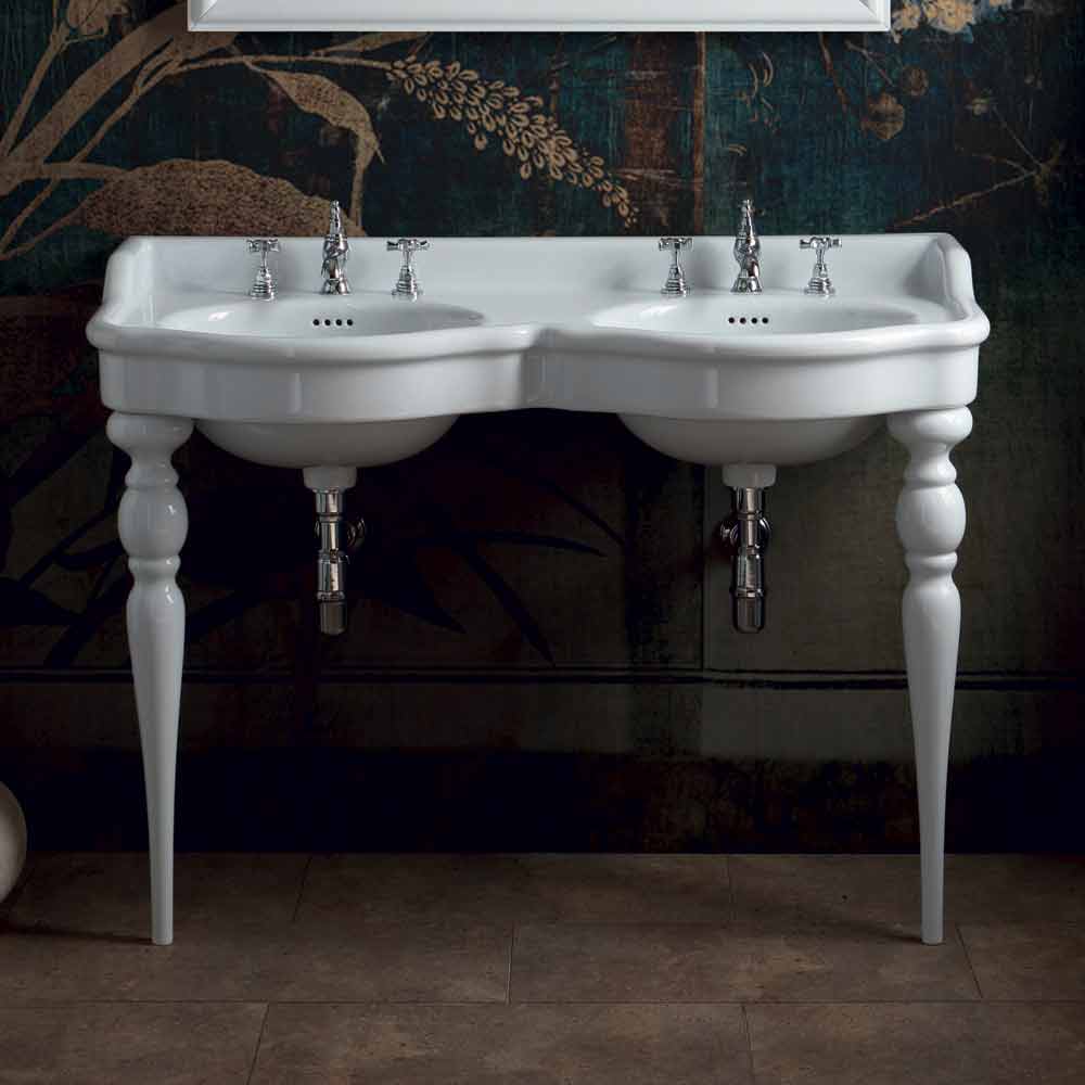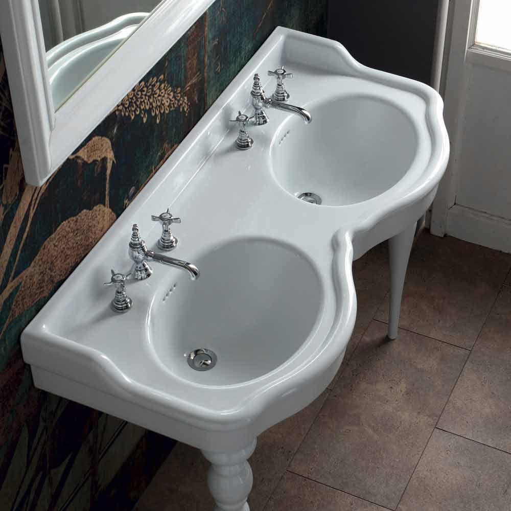 Countertop console washbasin with double basin made entirely of white ceramic.