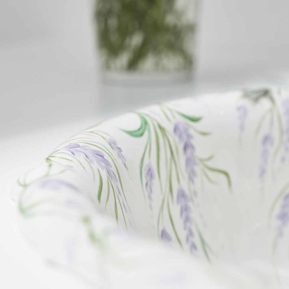 Built-in bathroom sink made in Italy in fine white porcelain with internal decorations of lavender sprigs handmade with the brush technique.