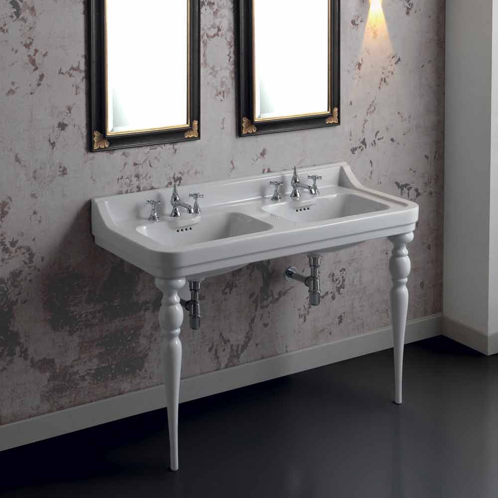 Countertop console washbasin with double basin made entirely of white ceramic.