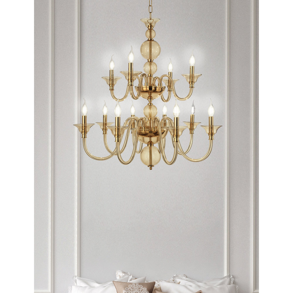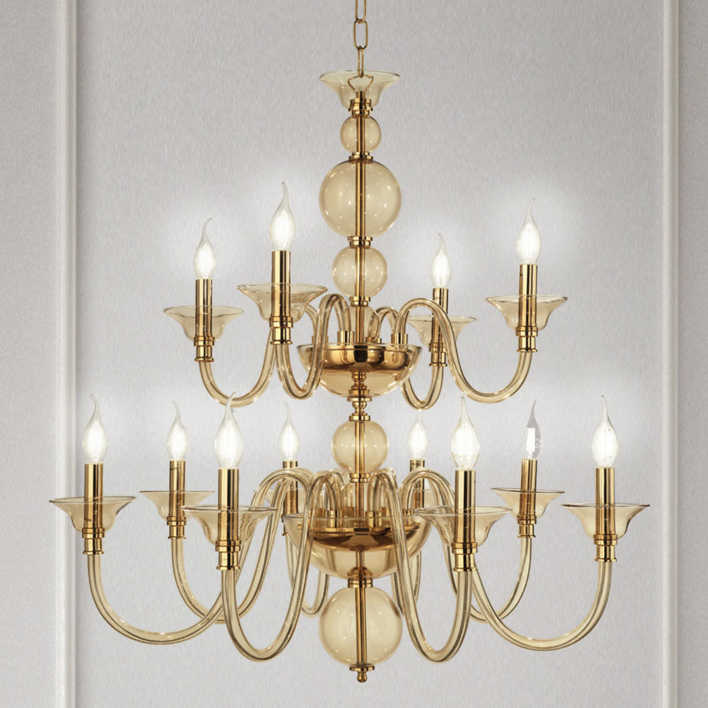 Ideal for those who want scenographic lighting with the style of times gone by, its classic and luxurious design is made up of spheres positioned one above the other for the light body, which allow a glimpse of the golden metal core, and from 12 arched arms, completely made of hand-crafted glass and available in different elegant shades, in order to fit completely into any place and satisfy different needs.