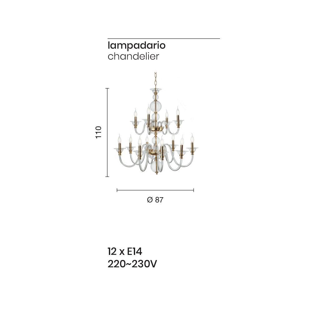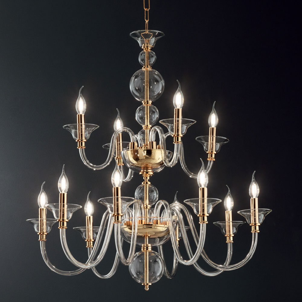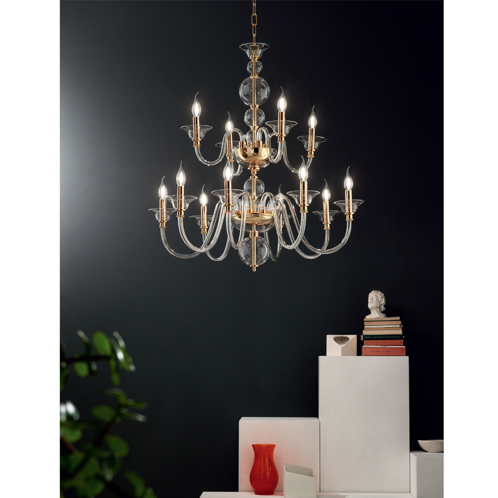 Classic Chandelier 12 Lights in Italian Handmade Glass and Metal - Memore