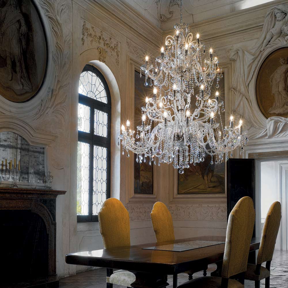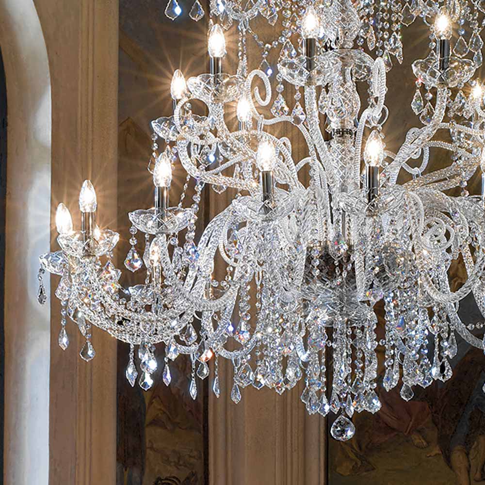 36-light chandelier made of crystal-finished Venetian glass with hand-worked lead pendants and details in polished chromed metal . Made through a craftsmanship , this complement is characterized by the wonderful arms worked by hand through the twisting technique which creates an exclusive result that aesthetically recalls the intertwining of a rope, giving personality to the chandelier. A real rain of light invades the structure of the chandelier and then spreads into the surrounding environment by means of refraction through the magic of sequins and crystal pendants with fine finishes, thus creating an evocative and dreamlike scenographic effect capable of enchanting and surprising. for its elegance and majesty .