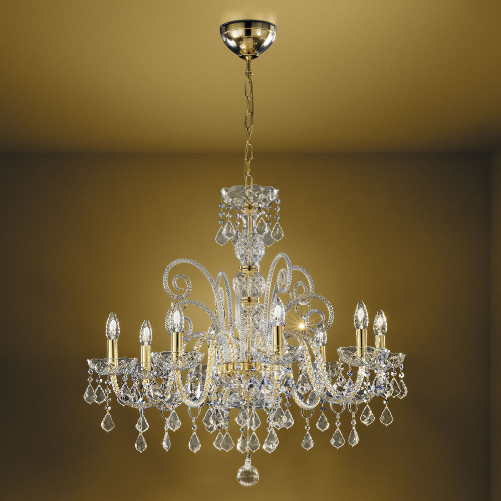 8-light Venice glass chandelier in crystal finish with lead pendants and shiny golden metal . Made through a craftsmanship , this complement is characterized by the wonderful arms worked by hand through the twisting technique which creates an exclusive result that aesthetically recalls the intertwining of a rope, giving personality to the chandelier. A real rain of light invades the structure of the chandelier and then spreads into the surrounding environment by means of refraction through the magic of sequins and crystal pendants with fine finishes, thus creating an evocative and dreamlike scenographic effect capable of enchanting and surprising. for its elegance and majesty .