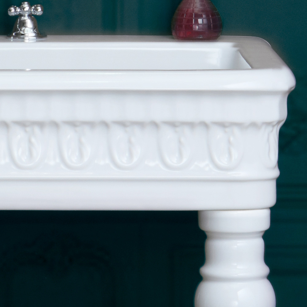 Console washbasin in white ceramic handcrafted through a 100% Made in Italy production . Majestic and imposing, this furnishing accessory with a classic and refined design stems from the desire to give life to a solution capable of creating perfect harmony both in classic spaces and in environments with modern furnishings within which it builds an unusual contrast for a creative and original effect .